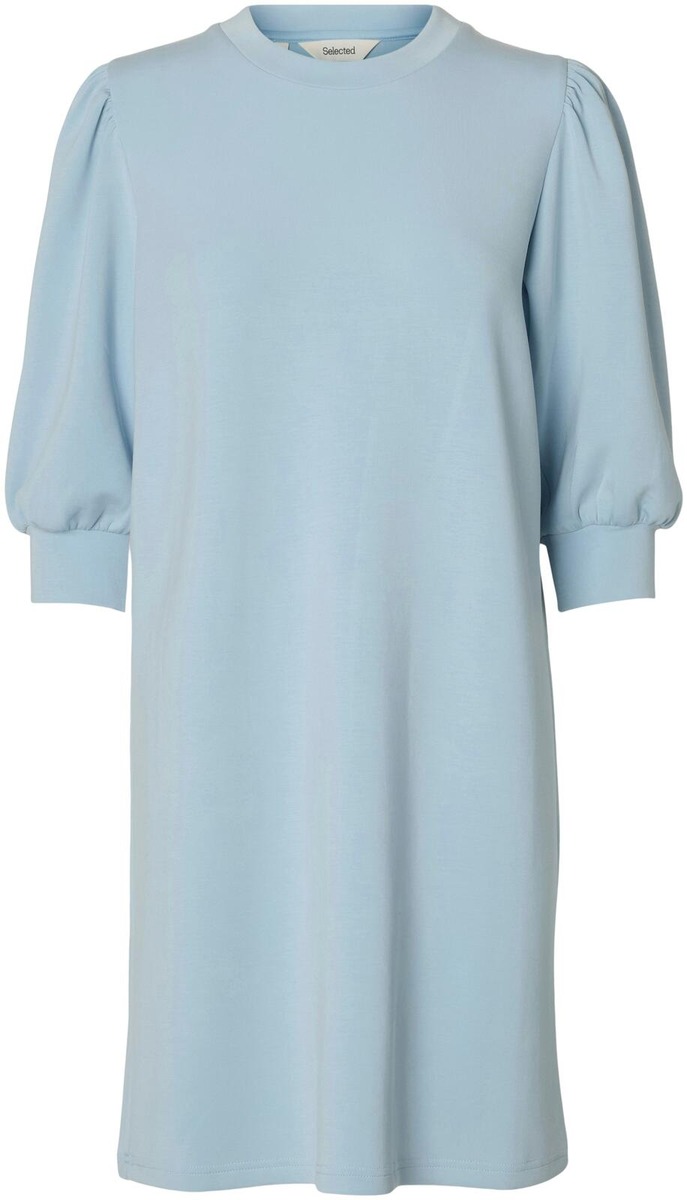 Tämä elegantti mekko tuo tyylikkyyttä jokaiseen tilaisuuteen. Sen pyöreä kaula-aukko ja 3/4-mittaiset laskostetut hihat luovat hienostuneen ilmeen, joka sopii täydellisesti sekä arkeen että juhlaan.