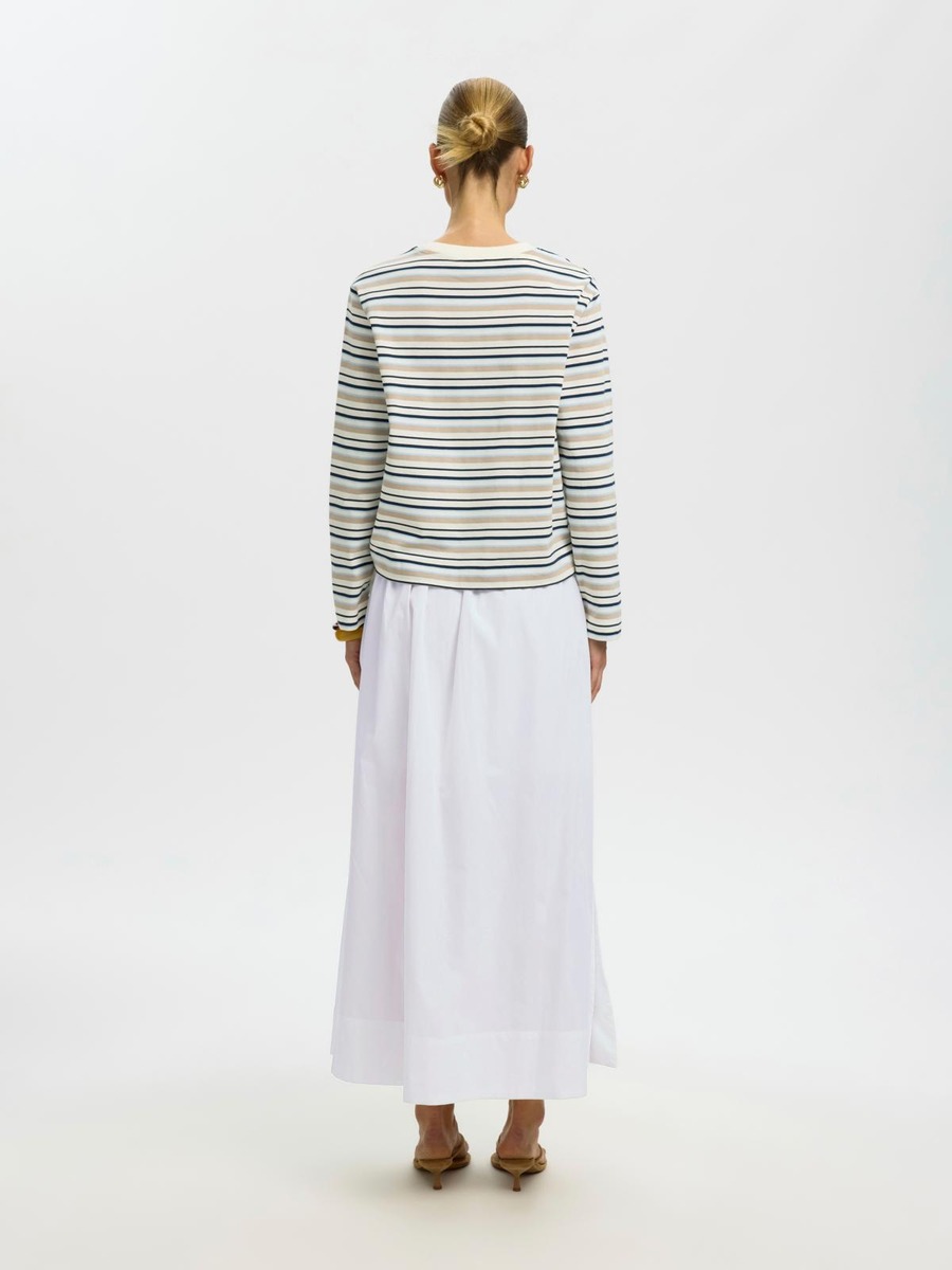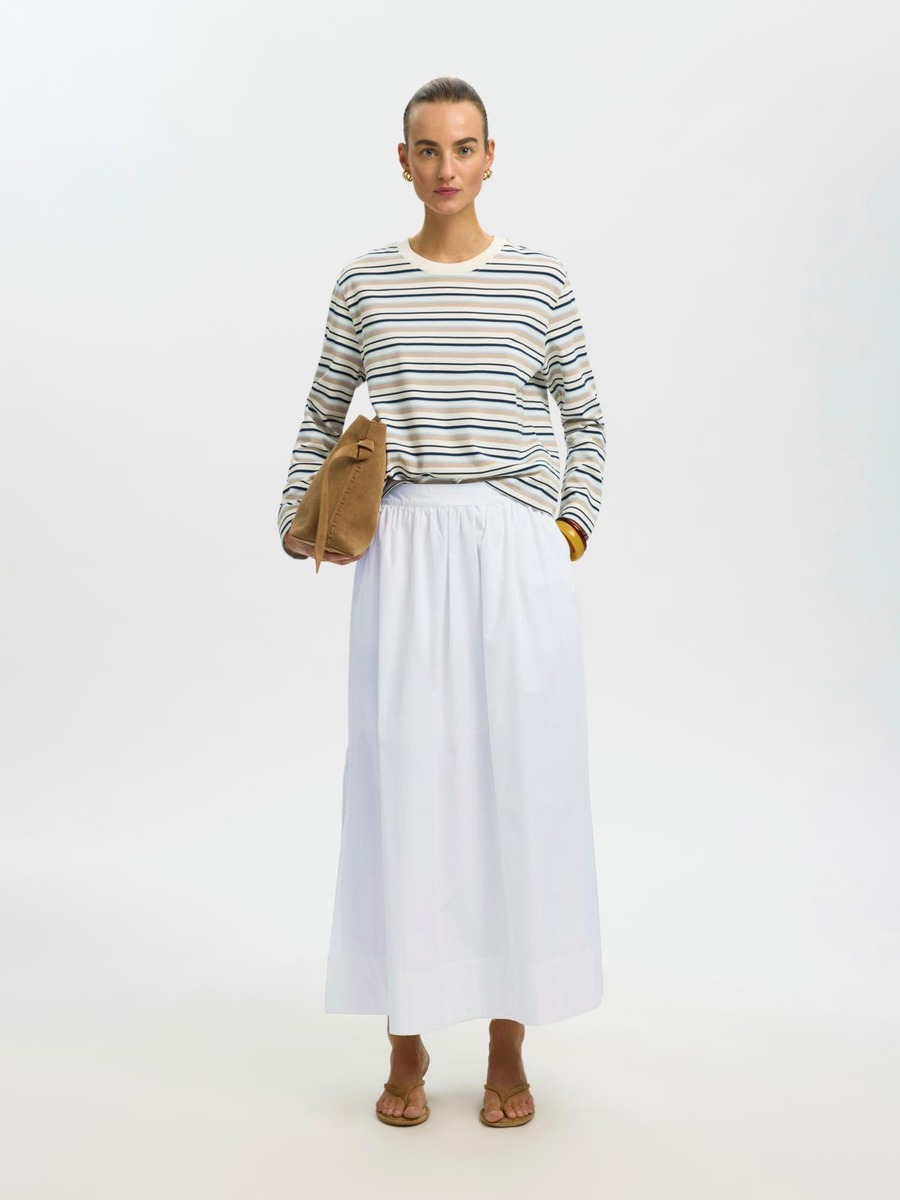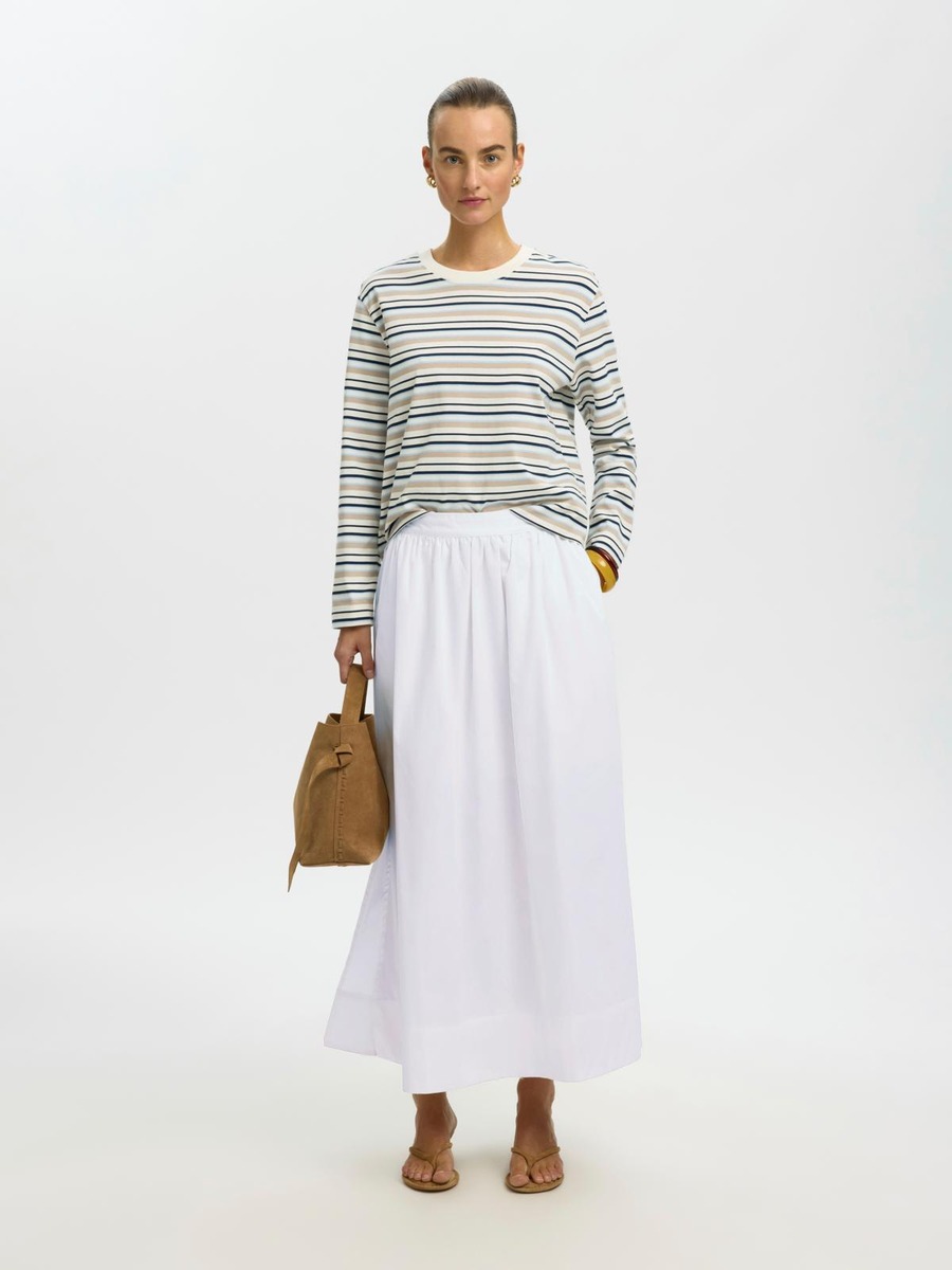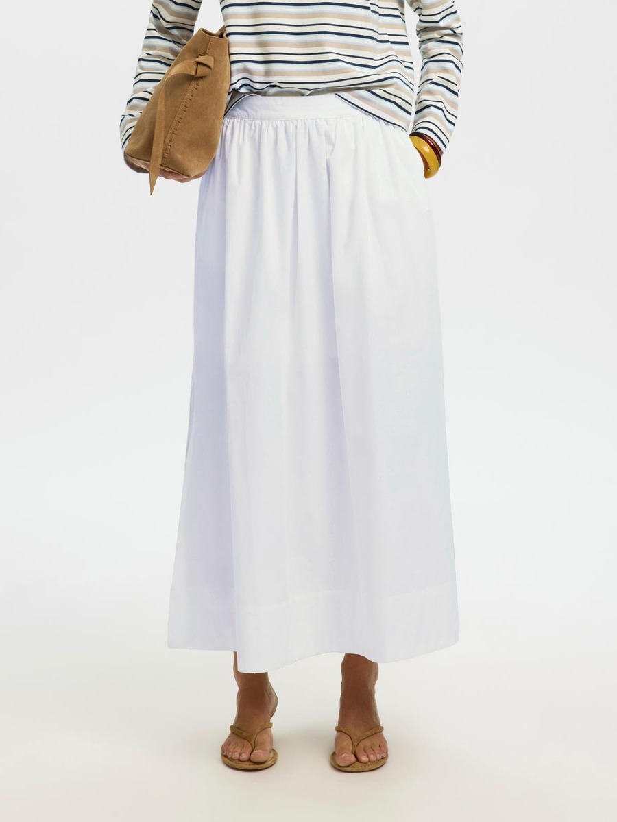 Tyylikäs ja mukava hame, joka ulottuu nilkkaan. Korkea vyötärö luo imartelevan siluetin, ja sivutaskut tarjoavat käytännöllisyyttä. Takana joustava vyötärönauha takaa mukavan istuvuuden, ja sivuhalkiot lisäävät liikkumavaraa.
