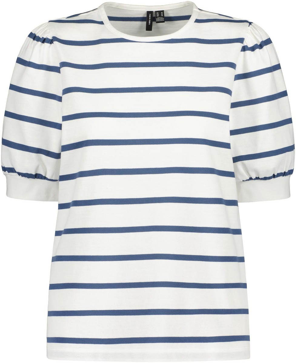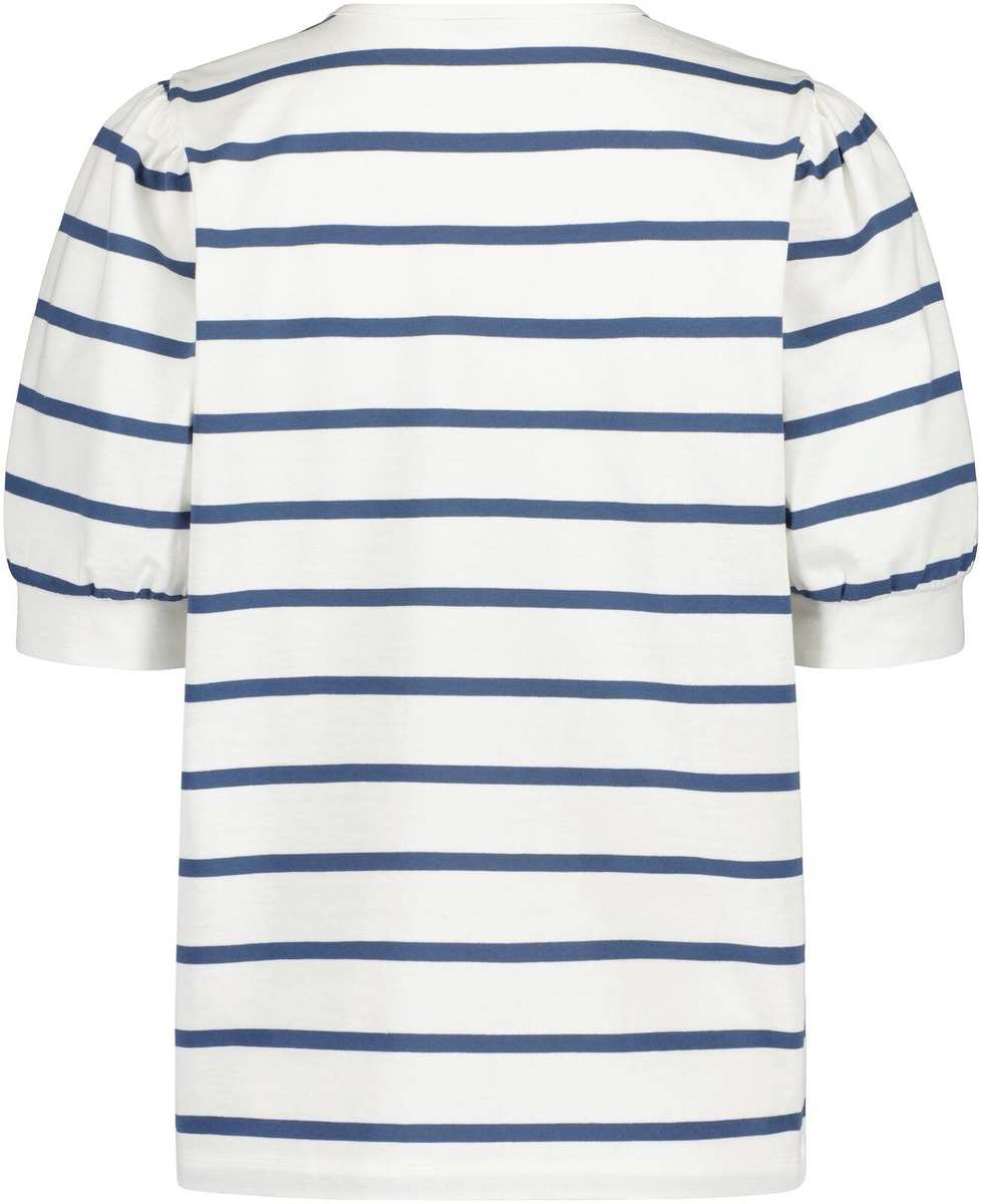 Lyhythihainen trikoopusero klassisilla raidoilla. Pyöreä pääntie ja naiselliset hihat.