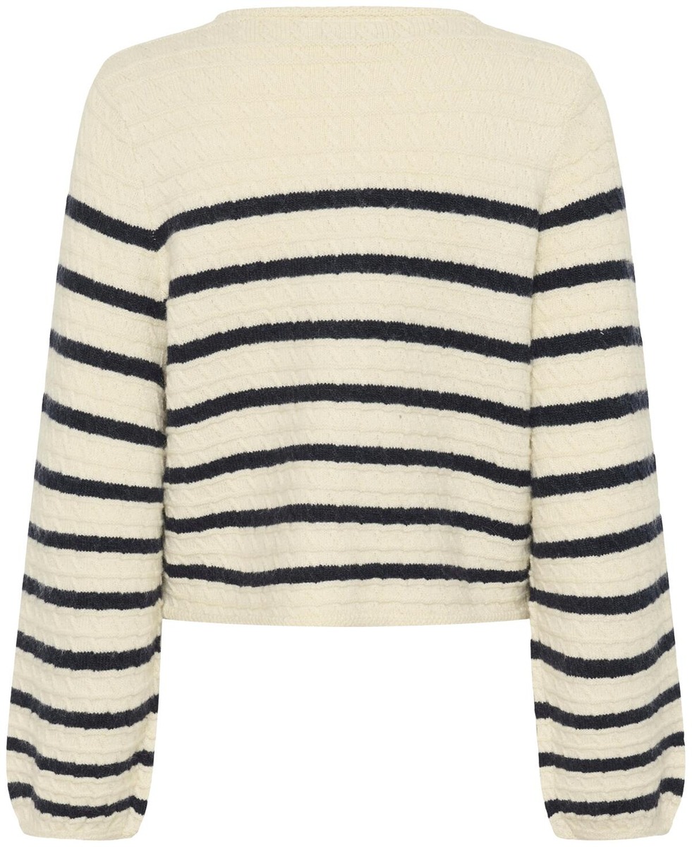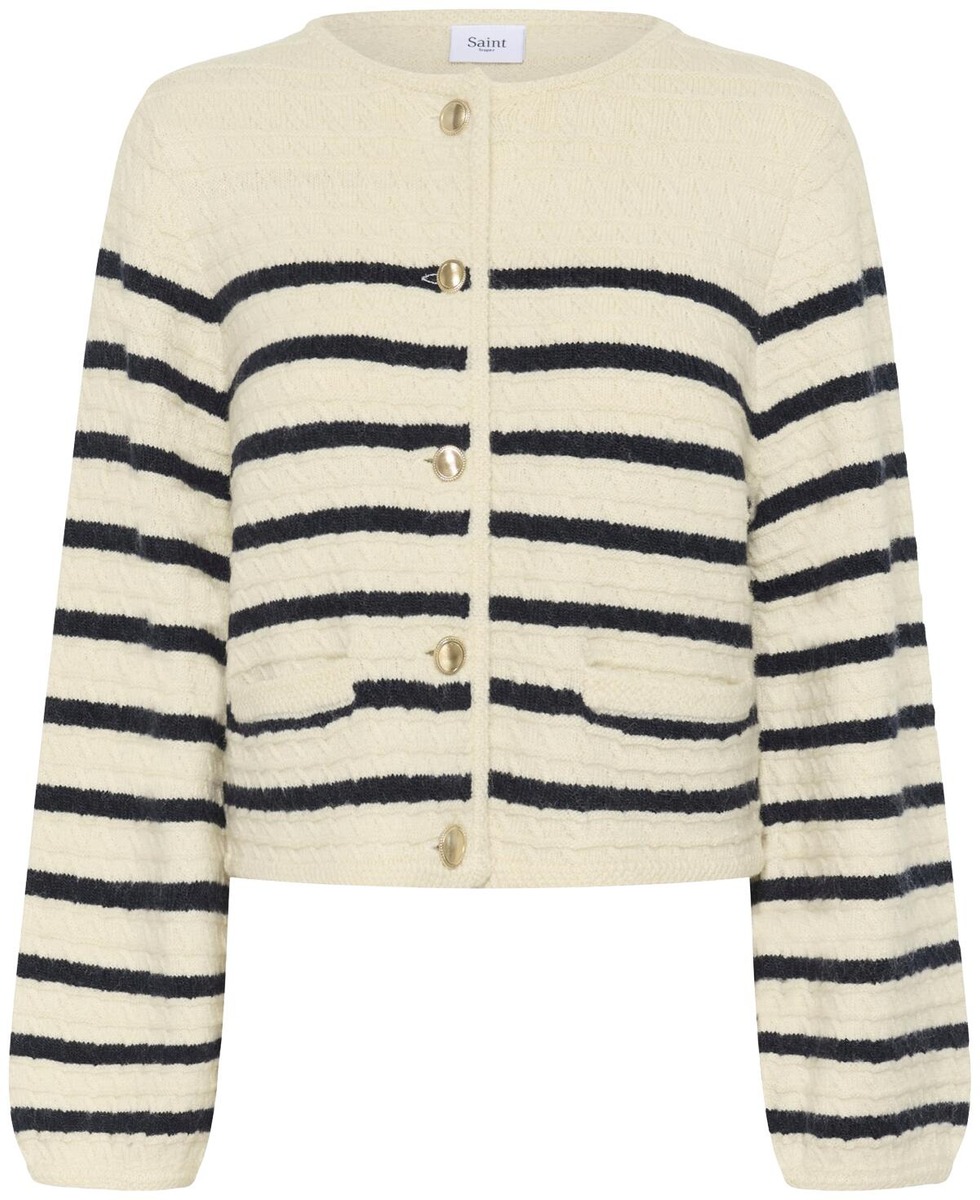 Vaivattoman tyylikäs ja mukava – tämä raidallinen neuletakki yhdistää klassisen tyylin moderniin tekstuuriin. Pehmeät vaakaraidat, o-pääntie ja näyttävät napit tekevät siitä täydellisen kerrospukeutumiseen tai yksinään käytettäväksi katseenvangitsijaksi. Lyhyt malli ja etutaskut tuovat leikkisän mutta huolitellun säväyksen tästä arjen suosikista.