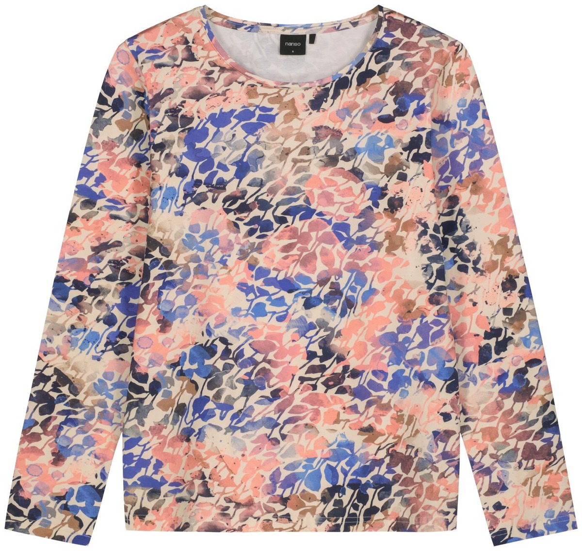 Naisten kuosillinen Sagitta-pusero. Suoralinjaisessa puserossa on tereellä viimeistelty pyöreä pääntie ja täyspitkät hihat. Puseron pituus koossa M on noin 65 cm. Materiaali on miellyttävän tuntuista ja helppohoitoista puuvilla-elastaani-neulosta.