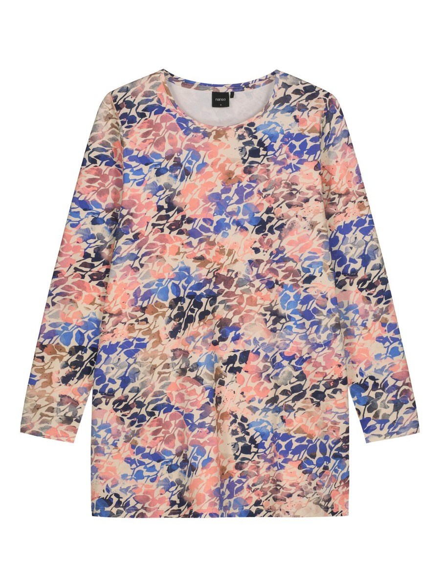 Naisten kuosillinen Sagitta-tunika. A-linjaisessa tunikassa on tereellä viimeistelty pyöreä pääntie, sivuissa taskut ja täyspitkät hihat. Tunikan pituus koossa M on noin 80 cm. Materiaali on miellyttävän tuntuista ja helppohoitoista puuvilla-elastaani-neulosta.