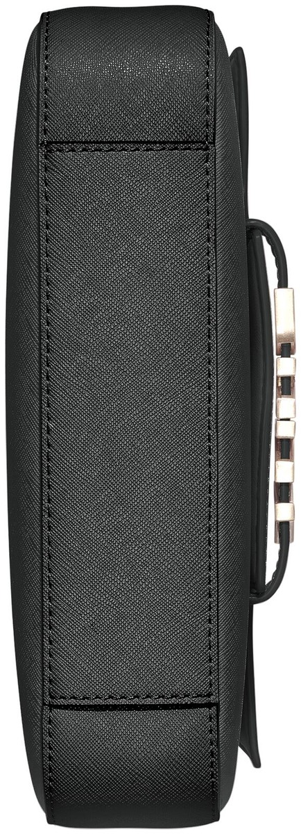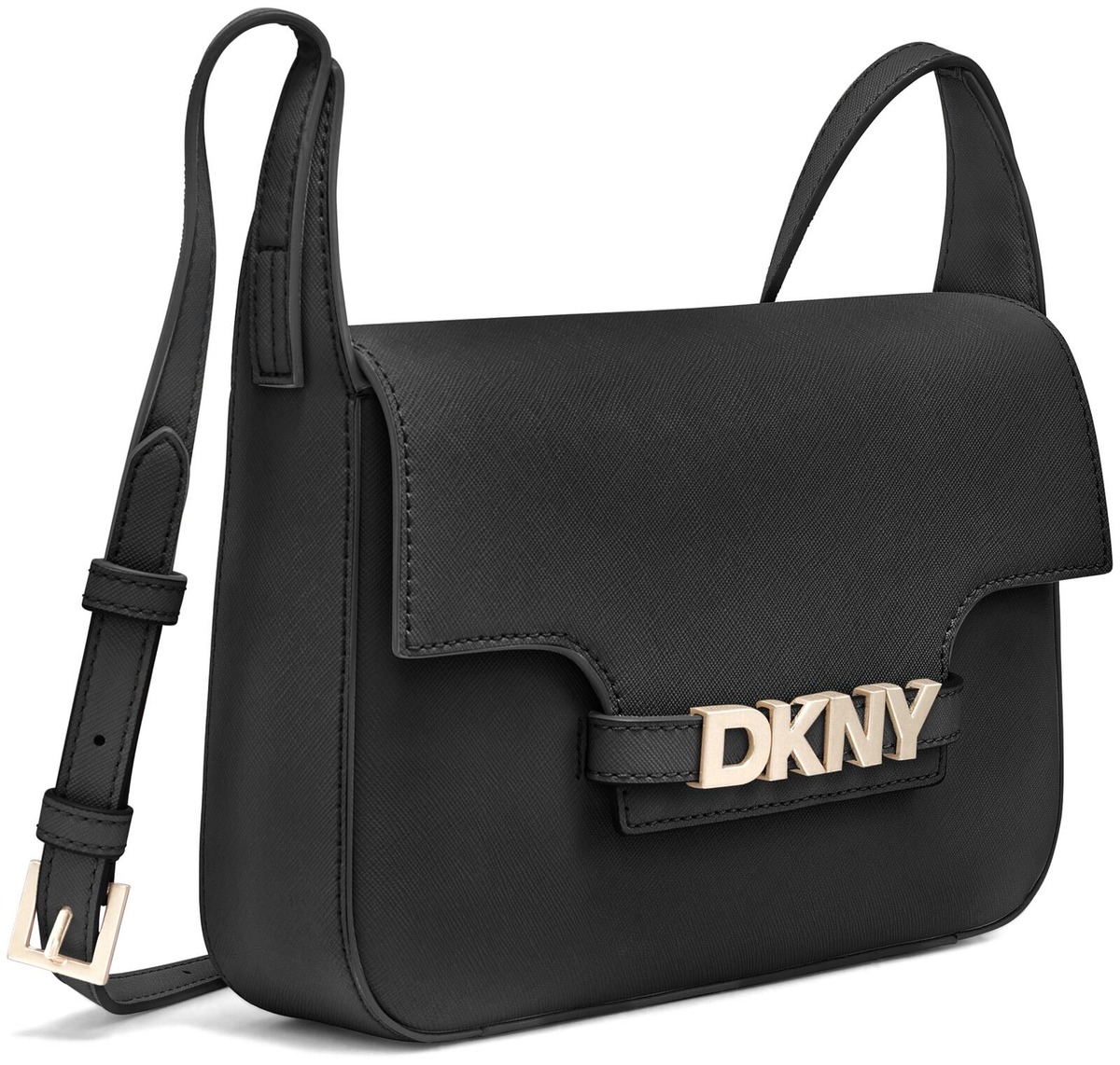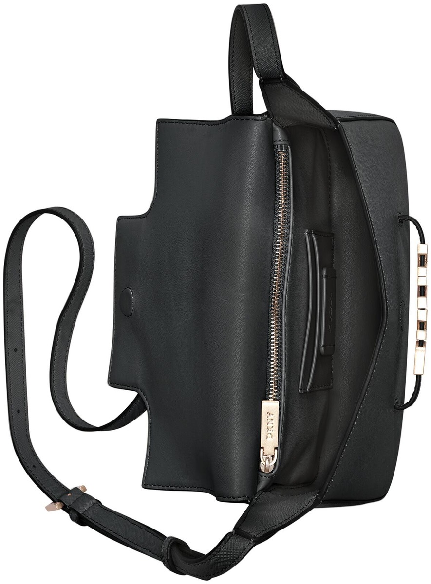 Sisällä vetoketjutasku ja 2 korttitaskua. Läppä suljetaan magneettinepilla. Mattakultainen DKNY logo. Säädettävä olkahihna.