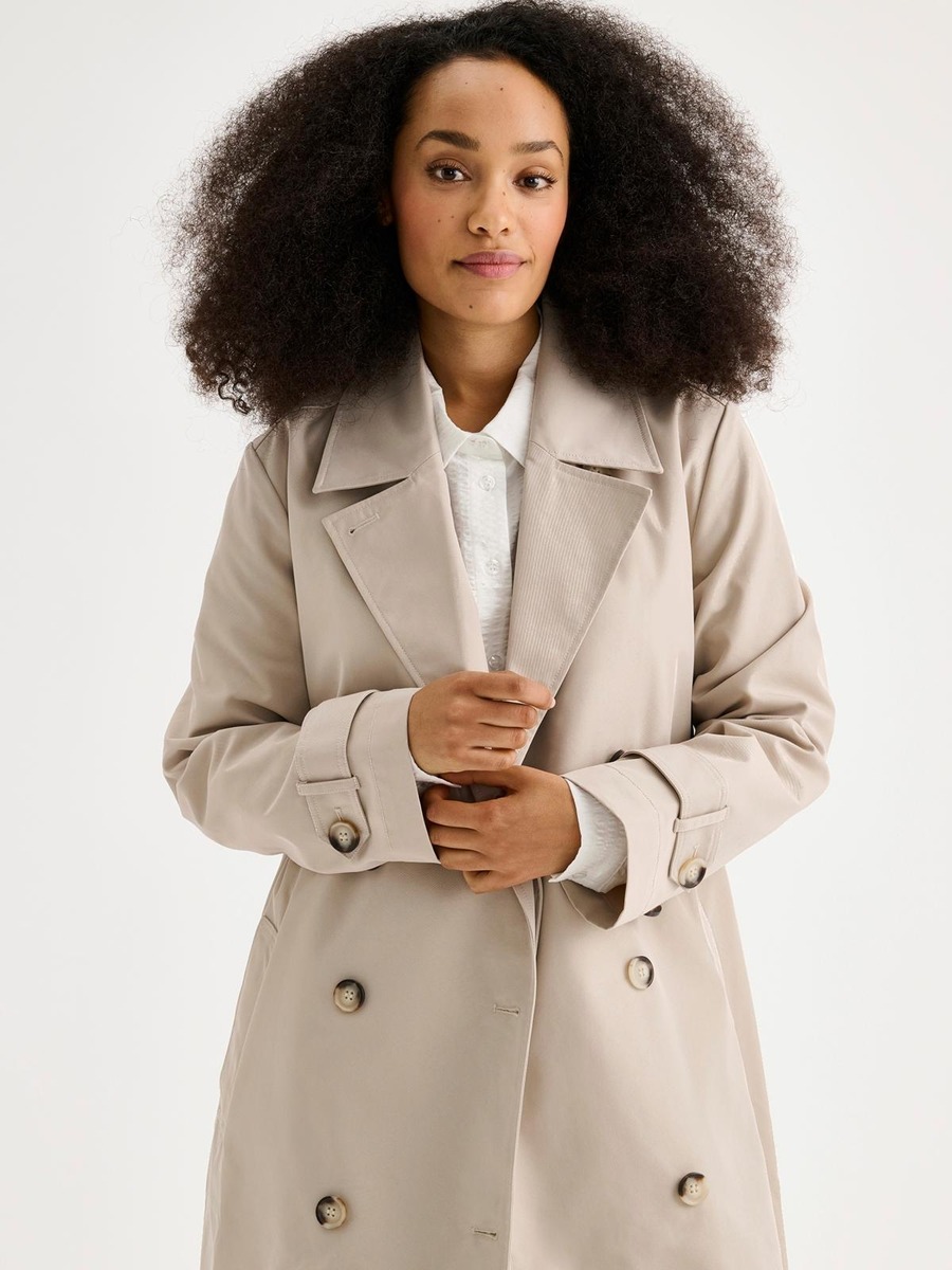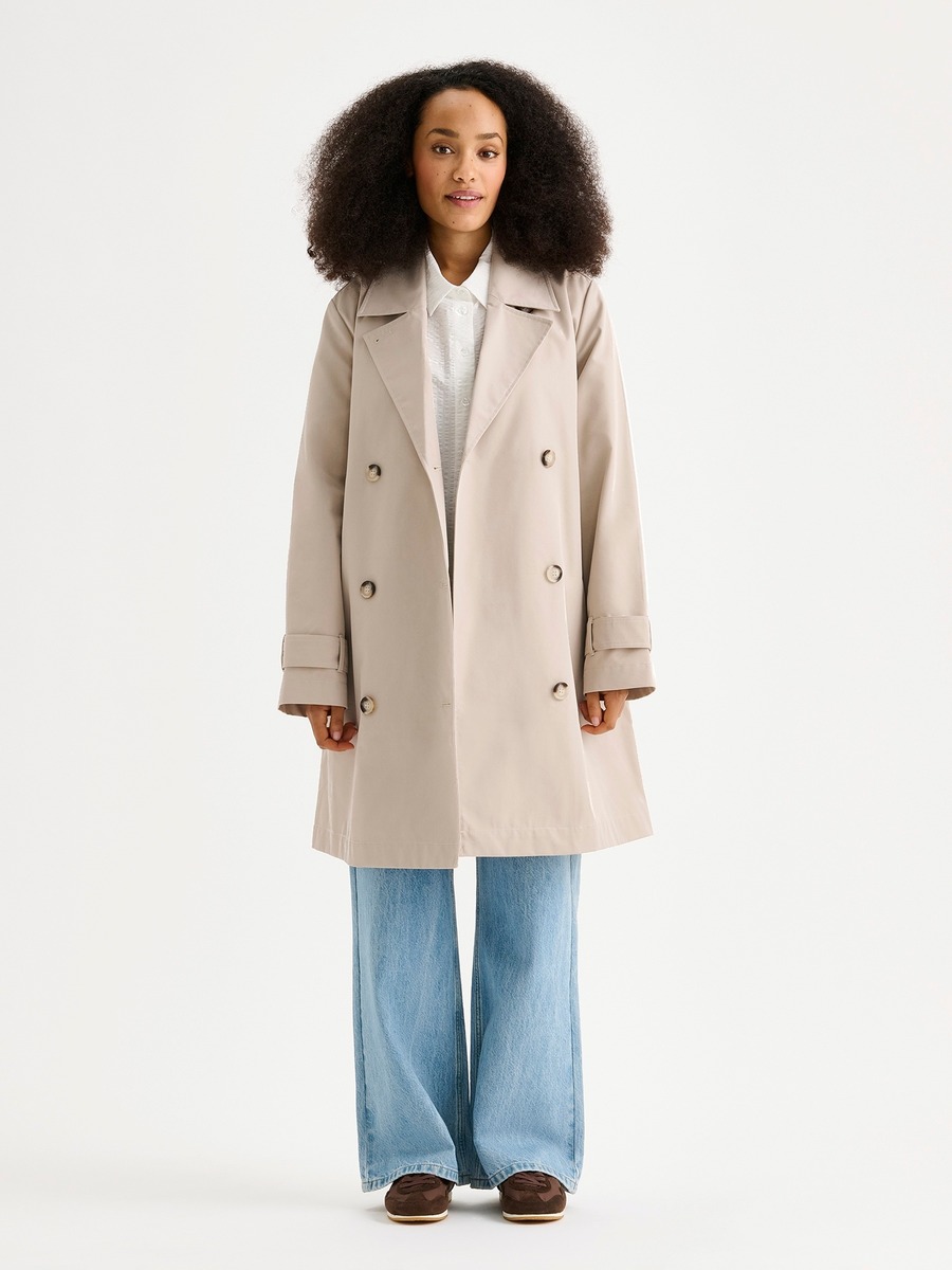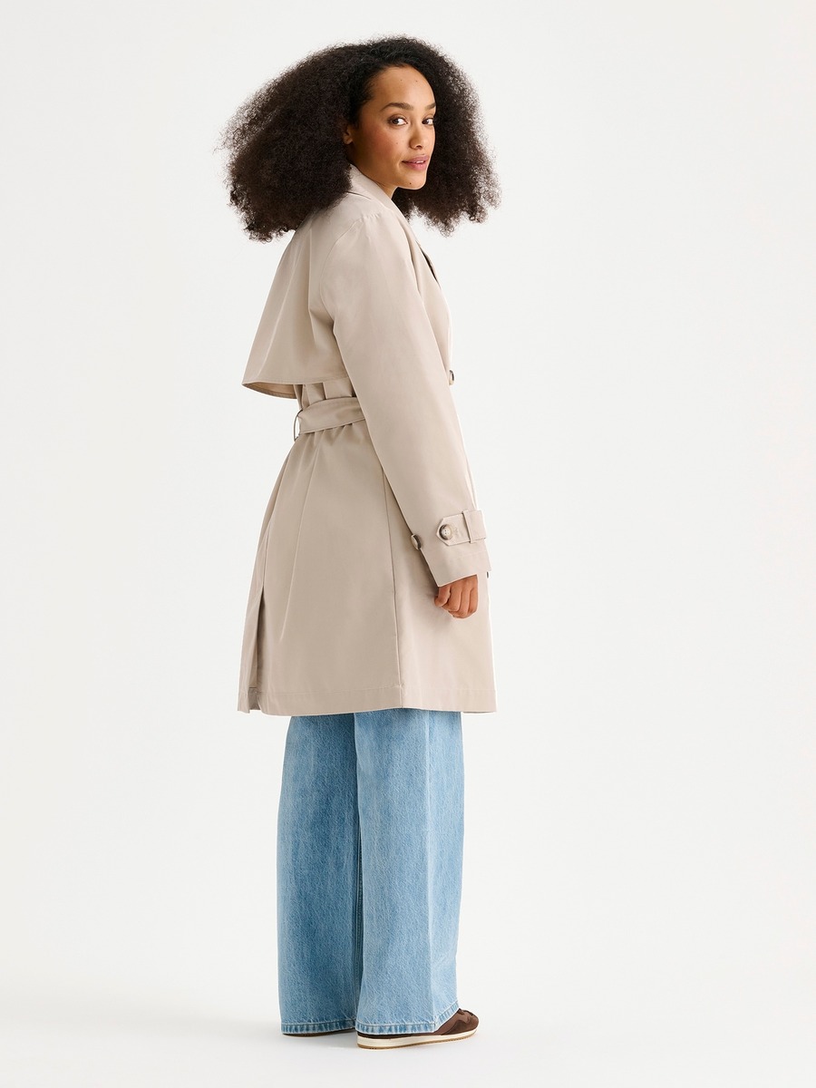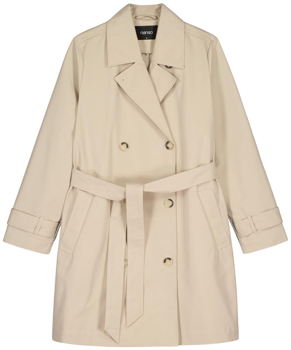 Naisten klassisen tyylikäs Midi Trenssi-takki. Takissa on käännekaulus ja kaksirivinen napitus. Täyspitkien hihojen hihansuissa on säätömahdollisuus kahdella napilla. Takissa on listataskut, vyö ja takana halkio.Takin pituus koossa M on noin 95 cm. Materiaali on vettähylkivää polyesteri-puuvillakangasta.