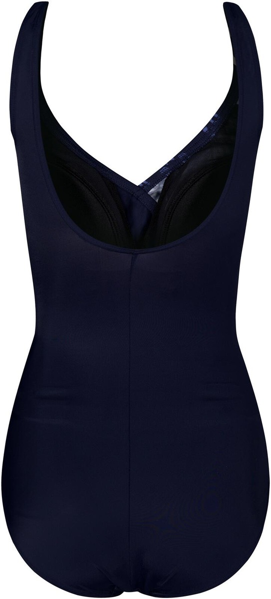 Uimapuku, topatut kupit, edustassa graafinen kuosi, muuten yksivärinen.
