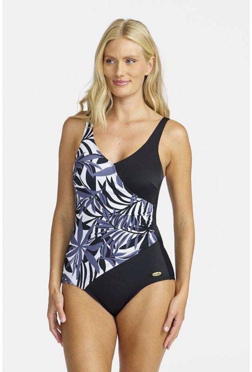 Uimapuku, topatut kupit, säädettävät olkaimet, edustassa lehtikuosi, muuten yksivärinen.