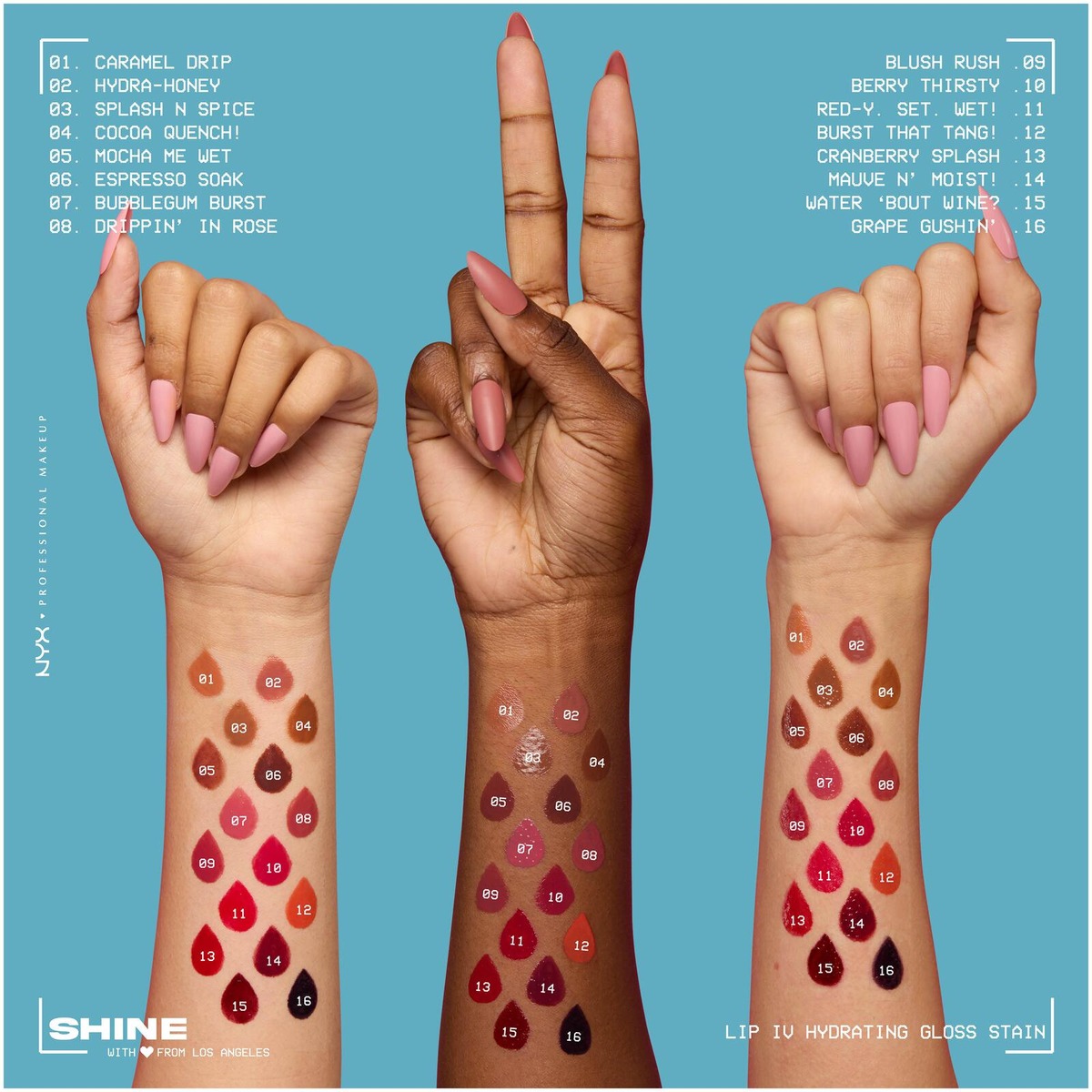 Mitä märemmän näköinen huulilook sitä parempi! NYX Professional Makeup Lip IV kosteuttava huulikiilto antaa välitöntä kiiltoa ja pitkäkestoisen lopputuloksen. Runsaasti kiiltoa ja pitkäkestoista väriä vain yhdellä pyyhkäisyllä. Koostumus sisältää magnesiumia, B12-vitamiinia ja kookosvettä. Lip IV -huulikiillon koostumus sitoo kosteutta huulille antaa intensiivisen pigmentin sekä kevyen ja virkistävän tunteen. Antaa märän näköisen "wet-shine” kostean lopputuloksen ja luonnolliseltalta näyttävän värin. Useita kiiltäviä sävyjä luonnollisen läpikuultavasta voimakkaampiin väreihin. • Kosteuttaa jopa 12 tuntia • Antaa tasaisen värin • Huulet tuntuvat kosteutetuilta • Väriä vain yhdellä pyyhkäisyllä • Välitöntä kiiltoa