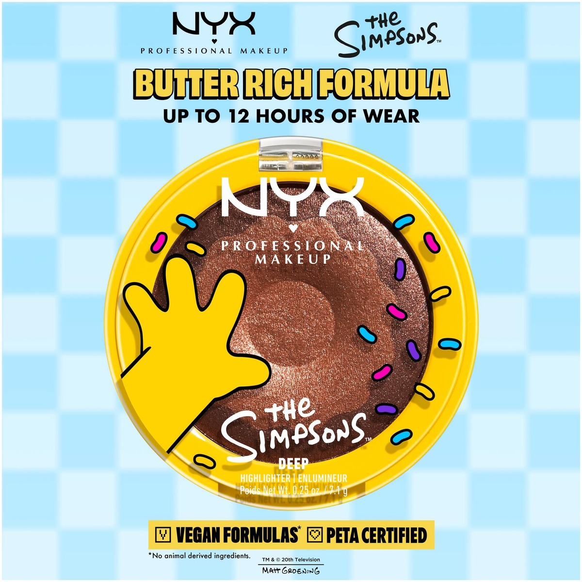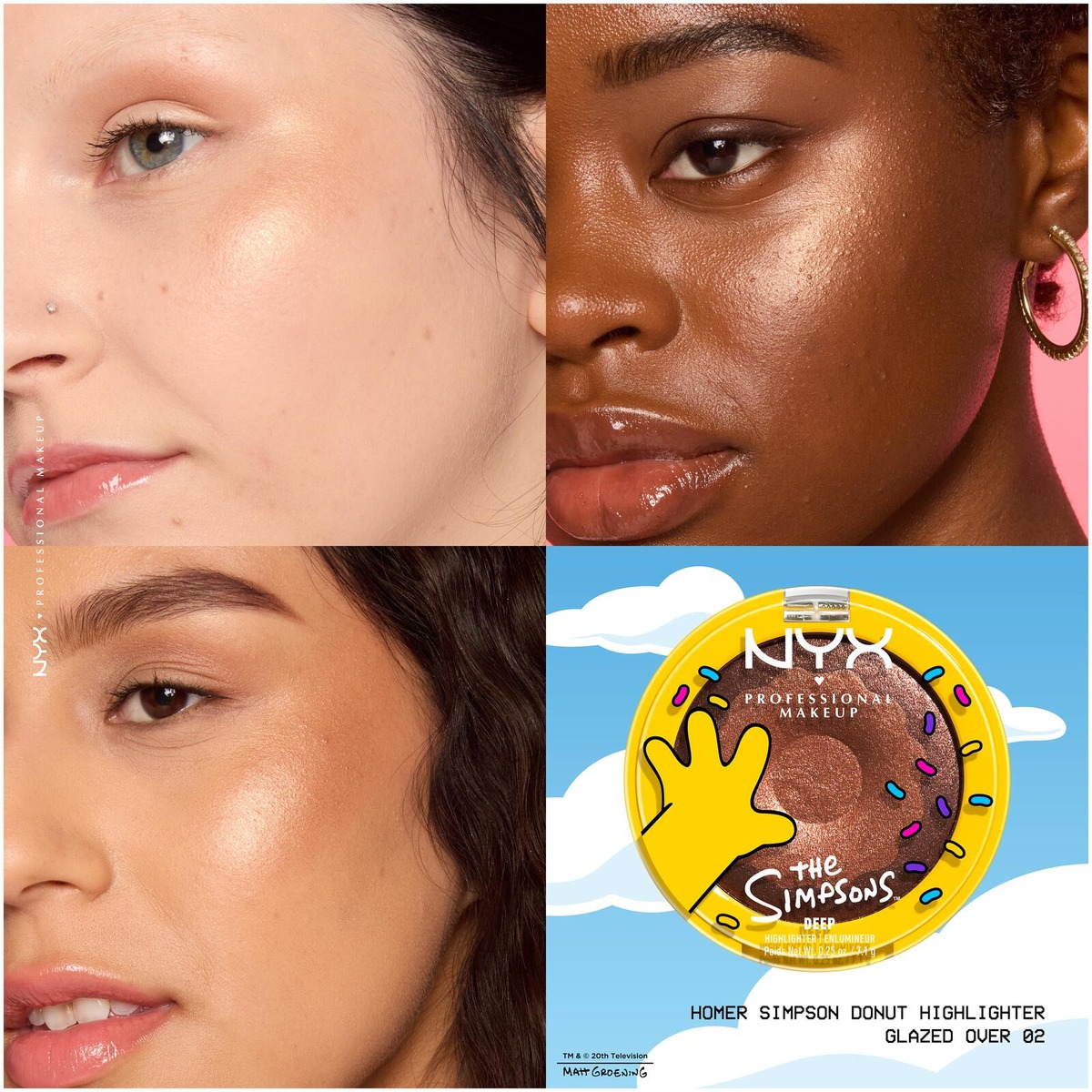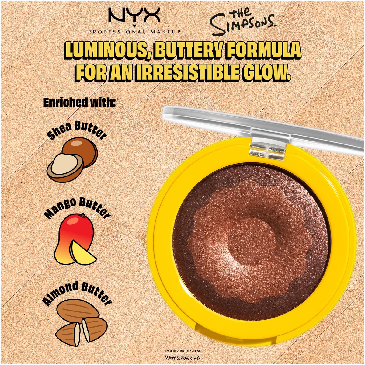 Anna ihollesi hehkua NYX Professional Makeup Homer Simpson Donut -korostusvärillä. Ihana koostumus antaa säteilevää hehkua, joka on herkullisempaa ja vastustamattomampaa kuin laatikollinen Homerin lempidonitseja. Vain yksi pyyhkäisy riittää kadehdittavan hehkun luomiseen, joten voit lisätä sekä kuorrutetta että koristetta. • Pehmeä koostumus • Kaunista hehkua vain yhdellä pyyhkäisyllä • Helposti häivytettävä voidemainen koostumus antaa lasimaista hehkua • Vegaaninen koostumus* *Ei sisällä eläinperäisiä ainesosia