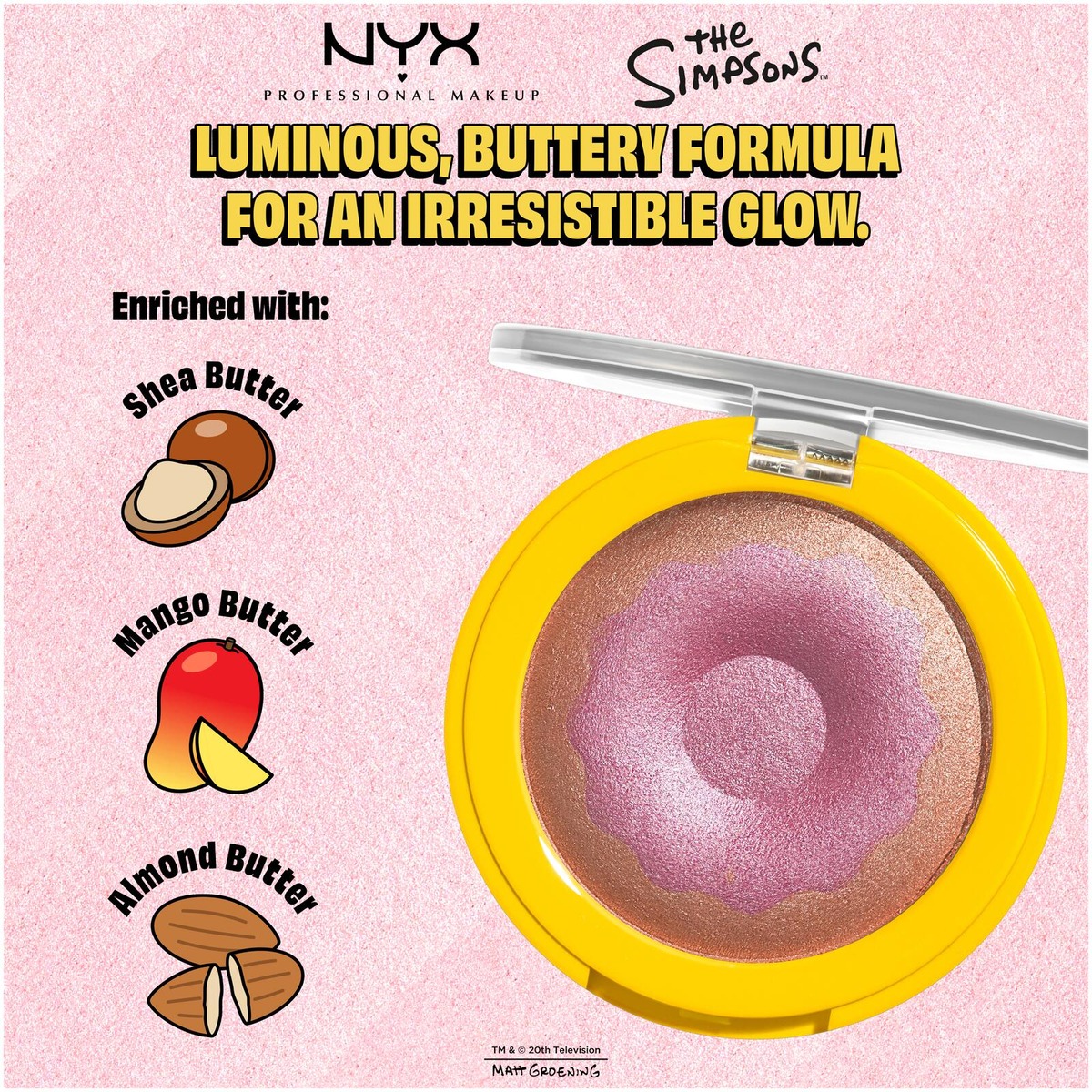 Anna ihollesi hehkua NYX Professional Makeup Homer Simpson Donut -korostusvärillä. Ihana koostumus antaa säteilevää hehkua, joka on herkullisempaa ja vastustamattomampaa kuin laatikollinen Homerin lempidonitseja. Vain yksi pyyhkäisy riittää kadehdittavan hehkun luomiseen, joten voit lisätä sekä kuorrutetta että koristetta. • Pehmeä koostumus • Kaunista hehkua vain yhdellä pyyhkäisyllä • Helposti häivytettävä voidemainen koostumus antaa lasimaista hehkua • Vegaaninen koostumus* *Ei sisällä eläinperäisiä ainesosia