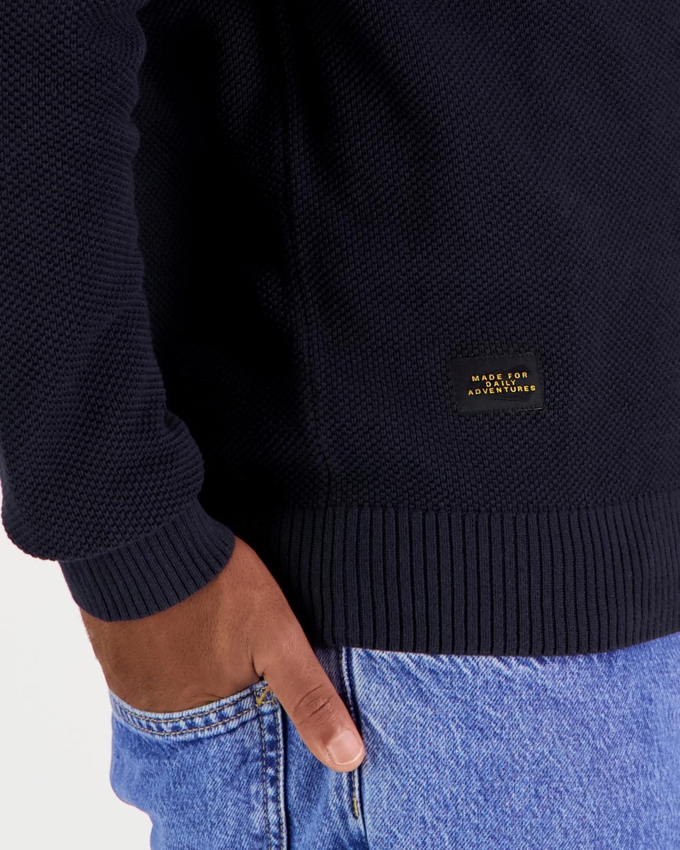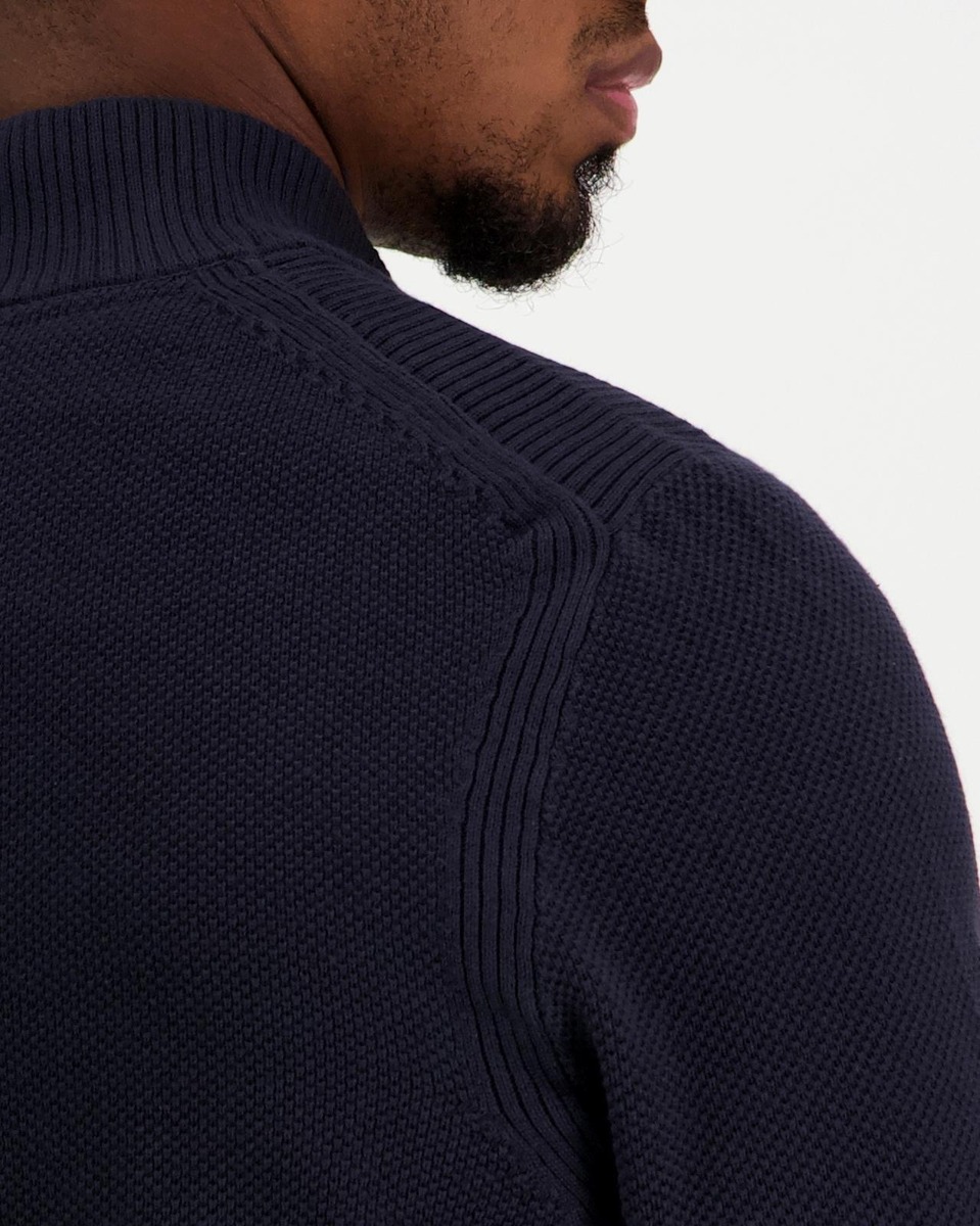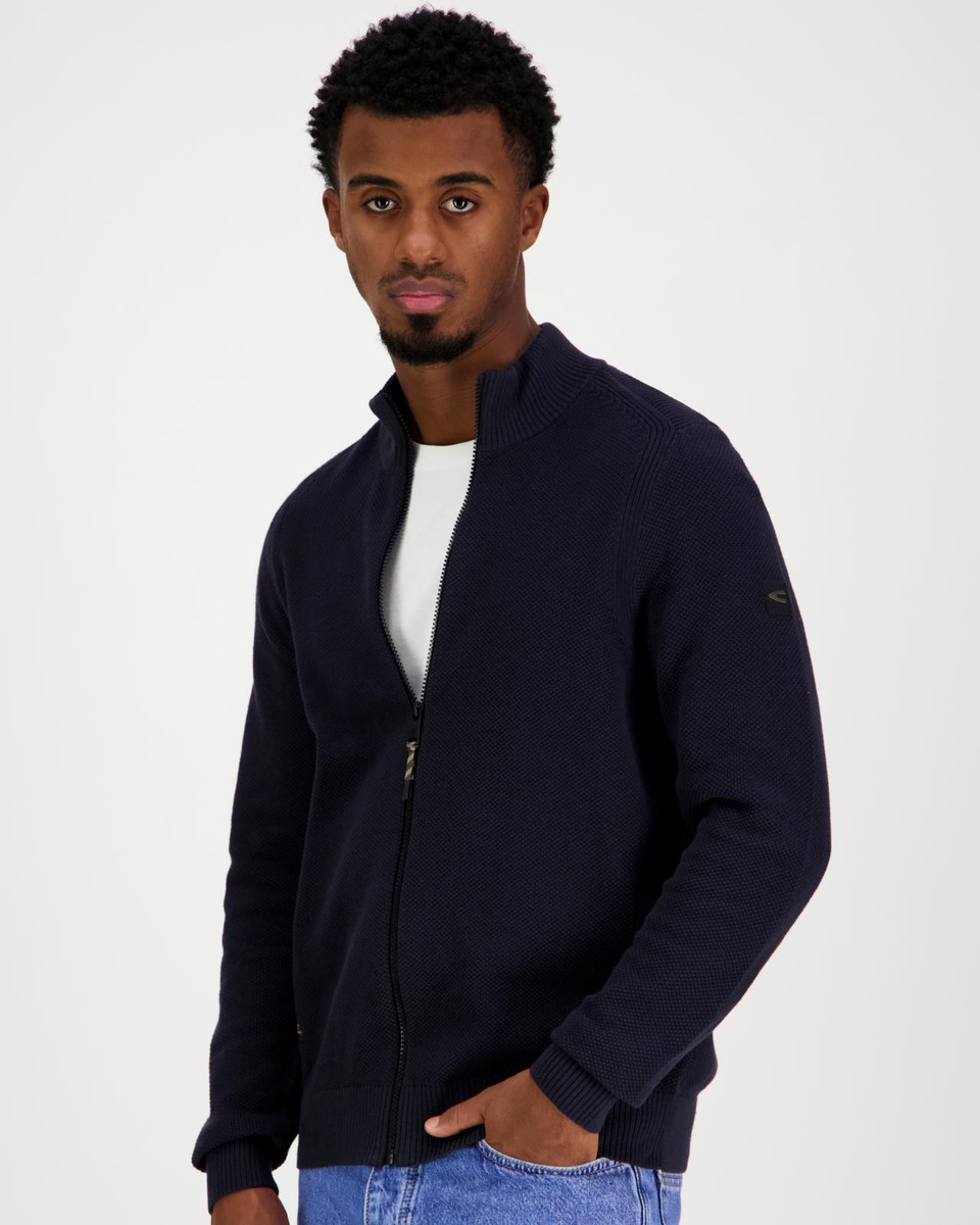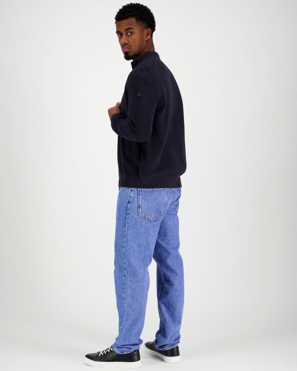 Pystykauluksinen puuvillainen neuletakki vetoketjukiinnityksellä. Normaali mitoitus.