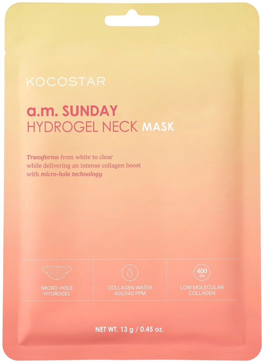 KOCOSTAR a.m. Sunday Hydrogel Neck Mask on hoitava kaulanaamio, joka sisältää 40 % norjalaista meriperäistä kollageenivettä. Se auttaa silottamaan hienoja juonteita, tasoittamaan ihon pintaa ja tekemään kaulan ihosta kimmoisamman. Ylellinen hydrogeelinaamio asettuu tiiviisti iholle ja ravitsee sitä tehokkaasti peptidien, kollageenin ja adenosiinin avulla. Naamion muuttuessa vähitellen läpikuultavaksi iho tuntuu kiinteämmältä ja sileämmältä – tarjoten täydellisen rentoutumishetken, aivan kuin sunnuntaiaamuna.