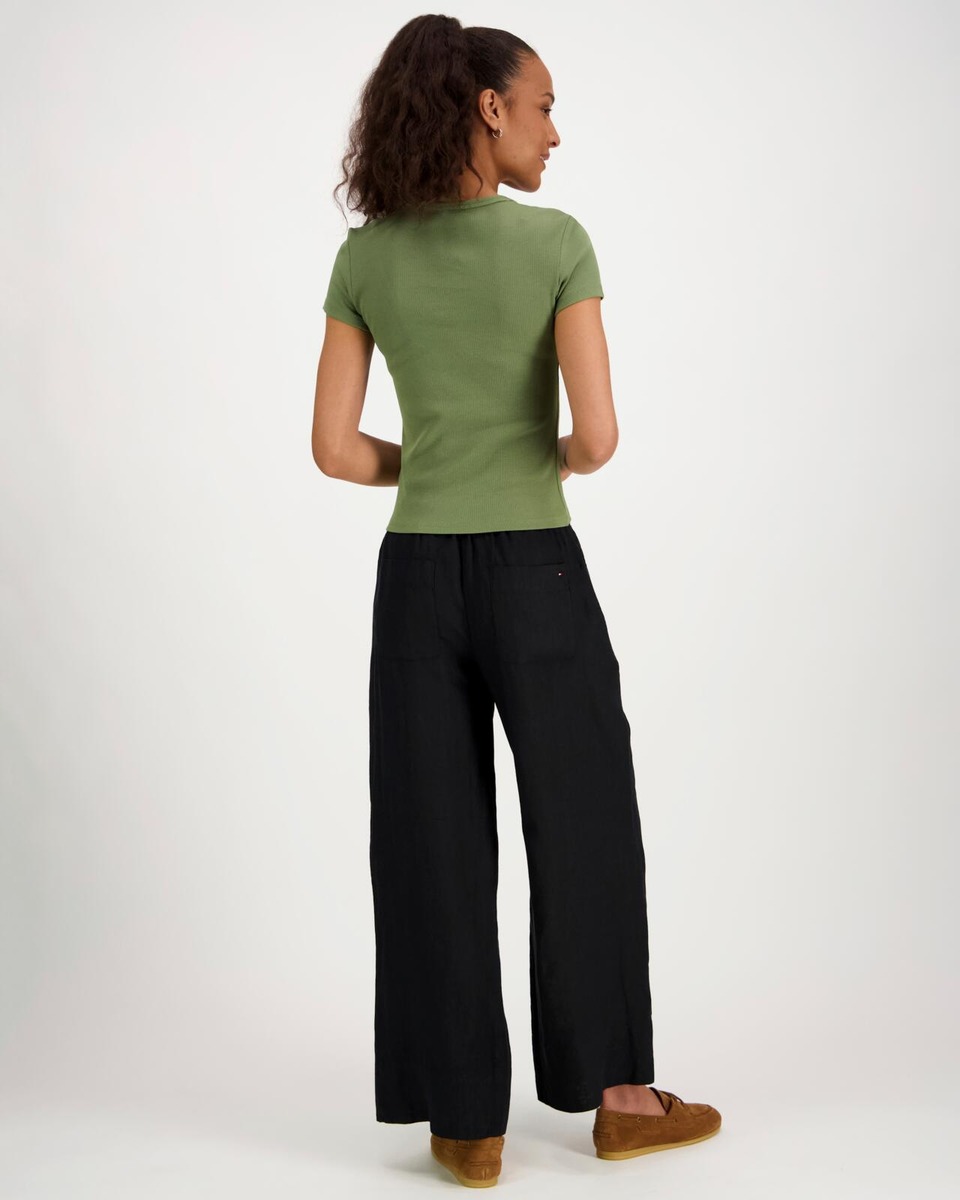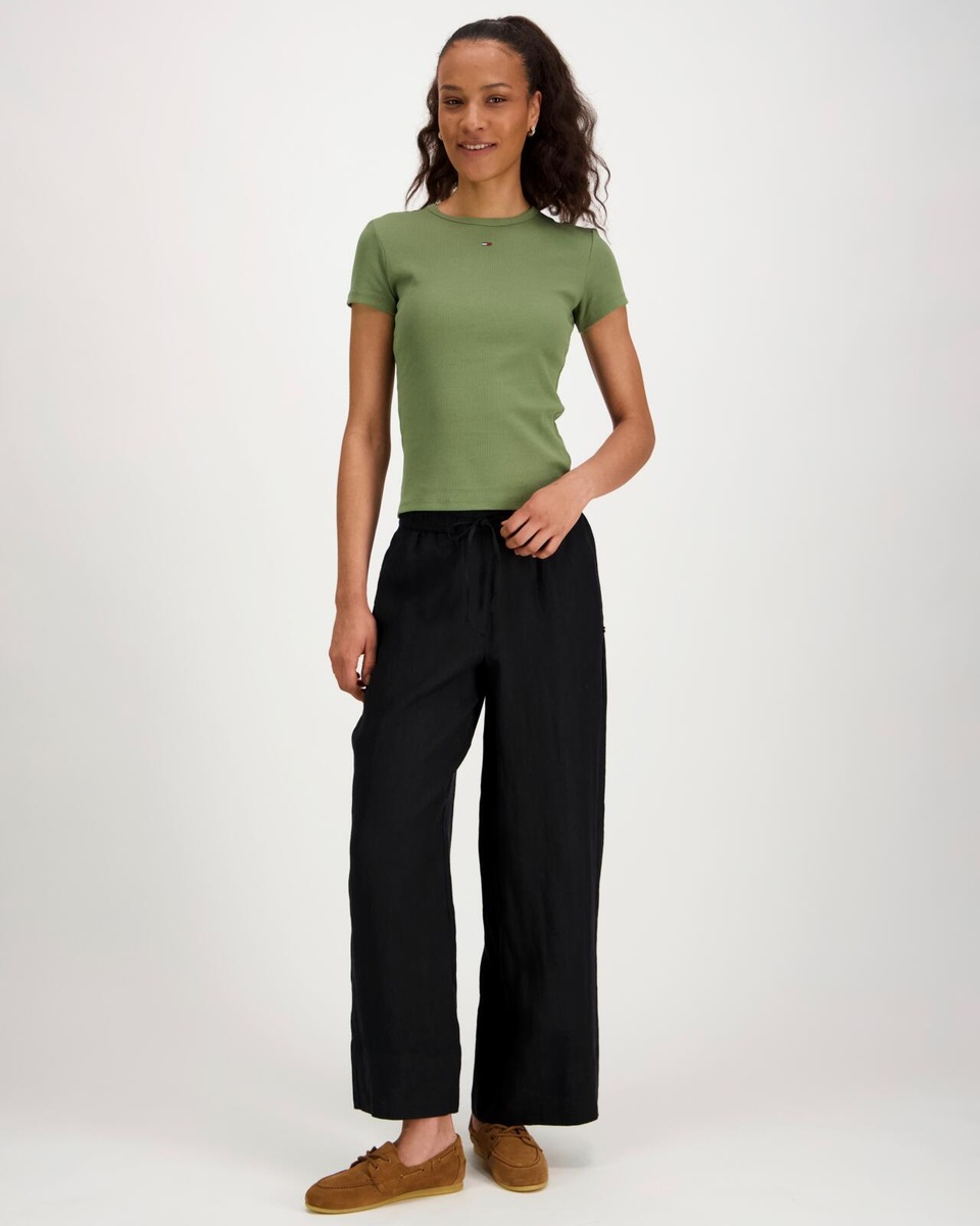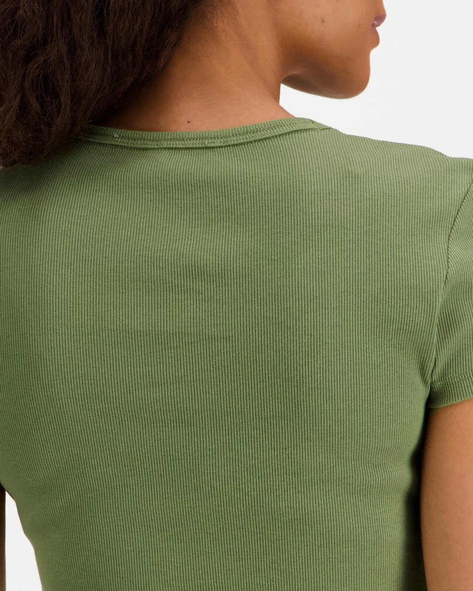 Joustava ribbineuloksinen T-paita paita myötäilee kauniisti vartalon muotoja ja tuntuu mielyttävältä päällä. Materiaalissa käytetty regeneratiivista puuvillaa.