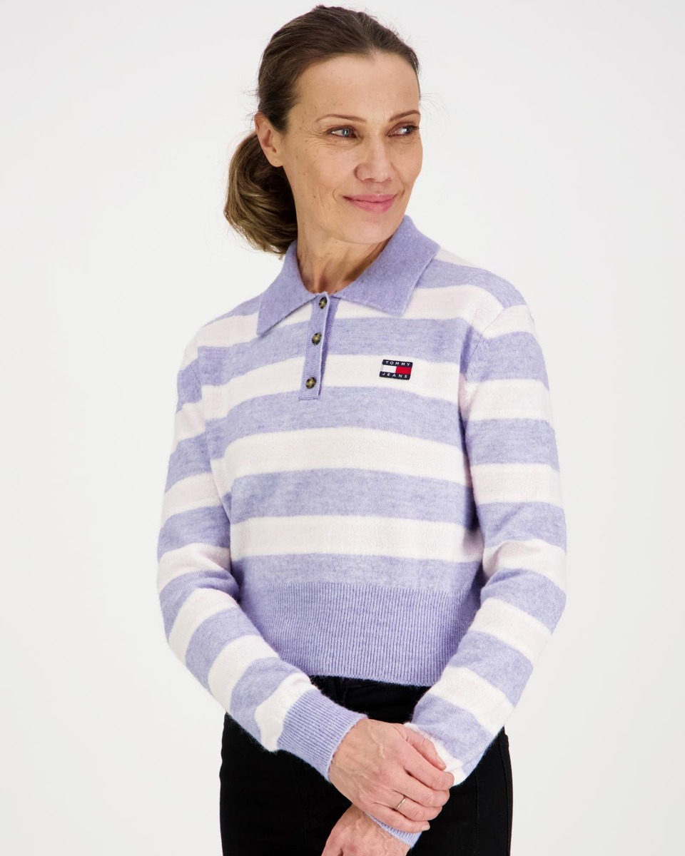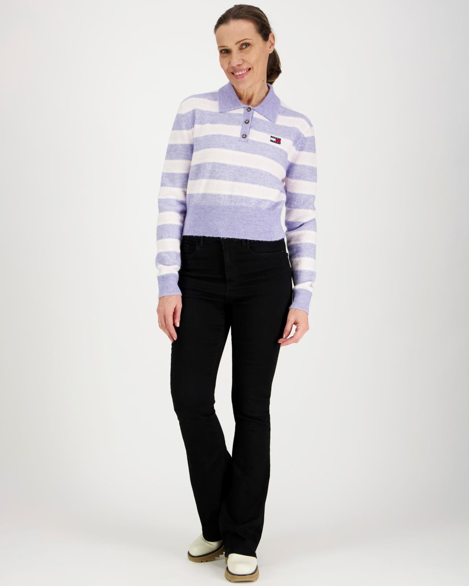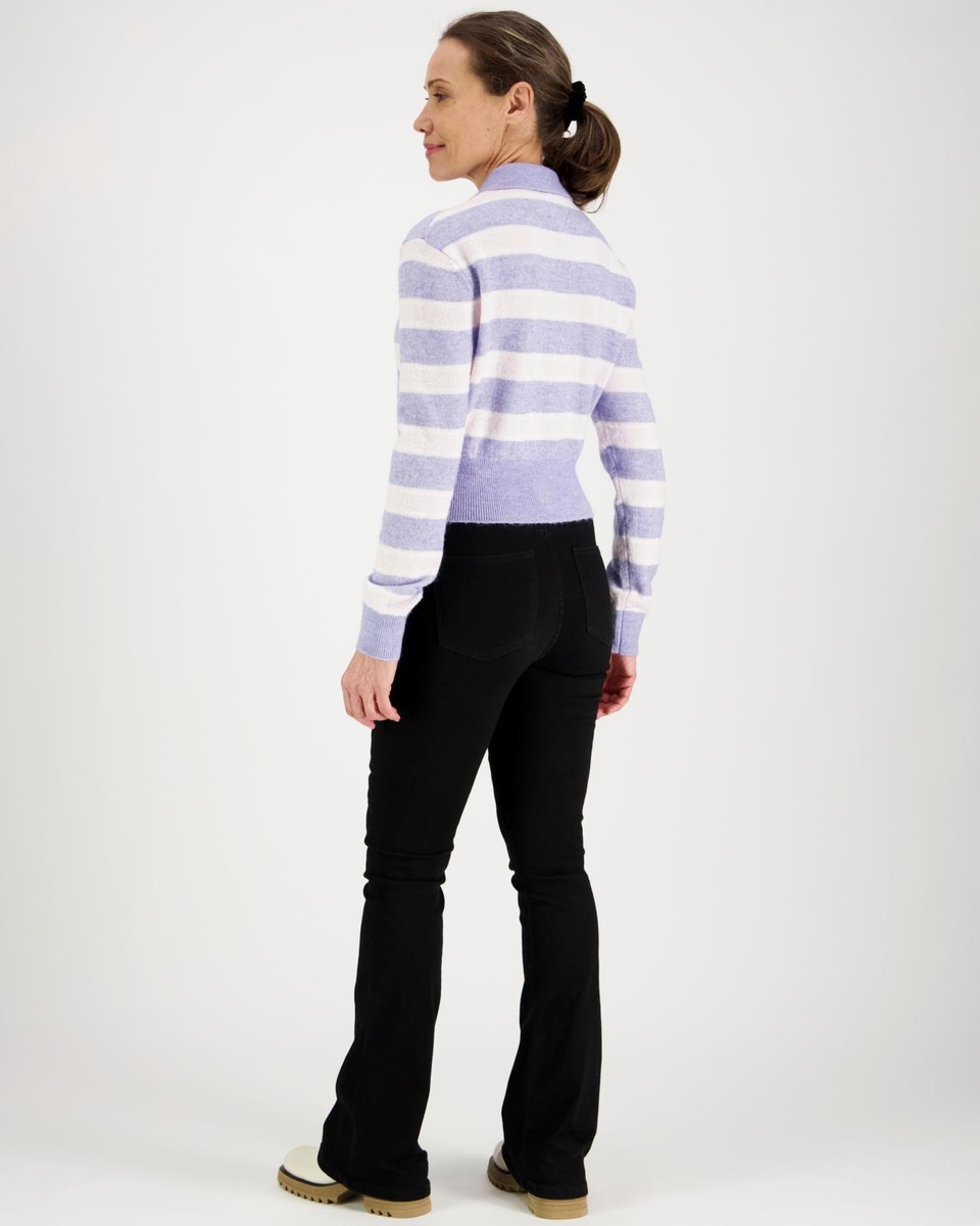 Pörröinen söpö raidallinen neule jossa pienet kaulukset. Materiaalissa mukana kierrätettyä polyesteriä, akryyliä, vastuullisesti tuotettua alpakan villaa sekä normaalia villaa.