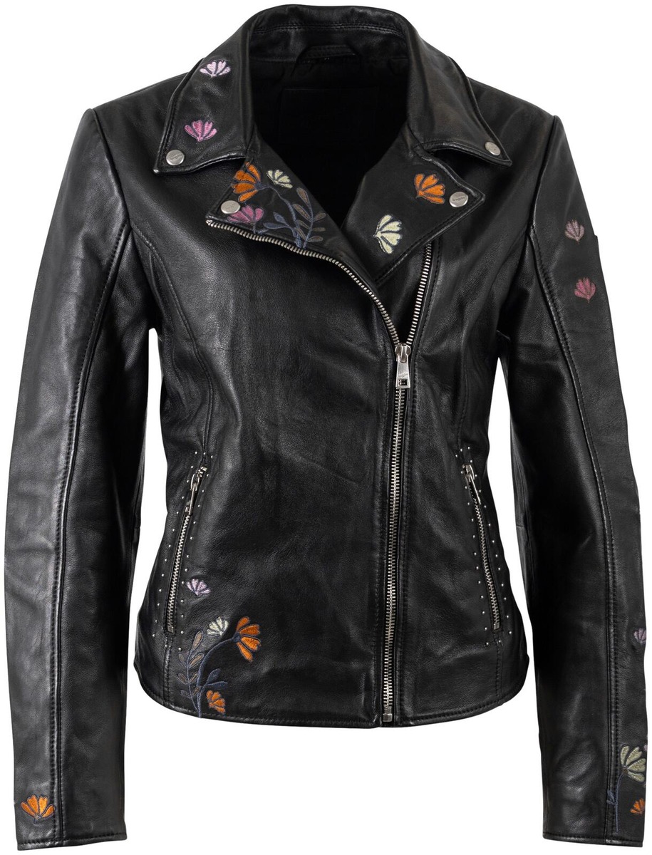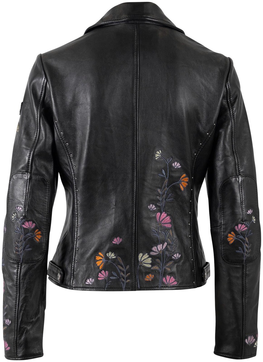 Bikermallinen nahkatakki jossa brodeeratut kukkakuviot. Trendikäs ja näyttävä valinta! Vuorimateriaali 100% luomupuuvilla, hihoissa sileäpintainen kierrätetty polyesteri.