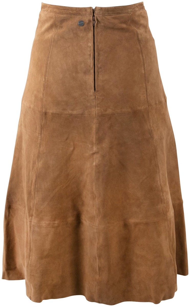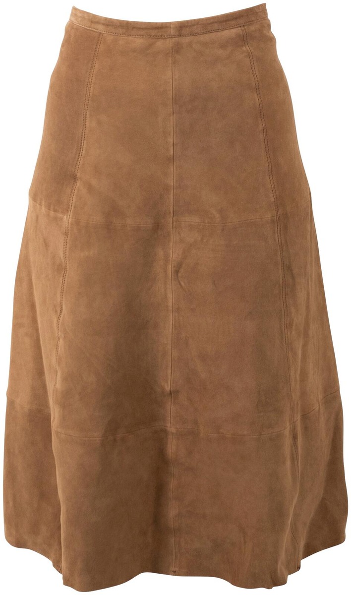 Upea A-linjainen mokkanahkahame pehmeää haljasnahkaa.Vetoketjukiinnitys ja vyötärökaitale. Vuorimateriaali satiinipintaista kierrätettyä polyesteria.