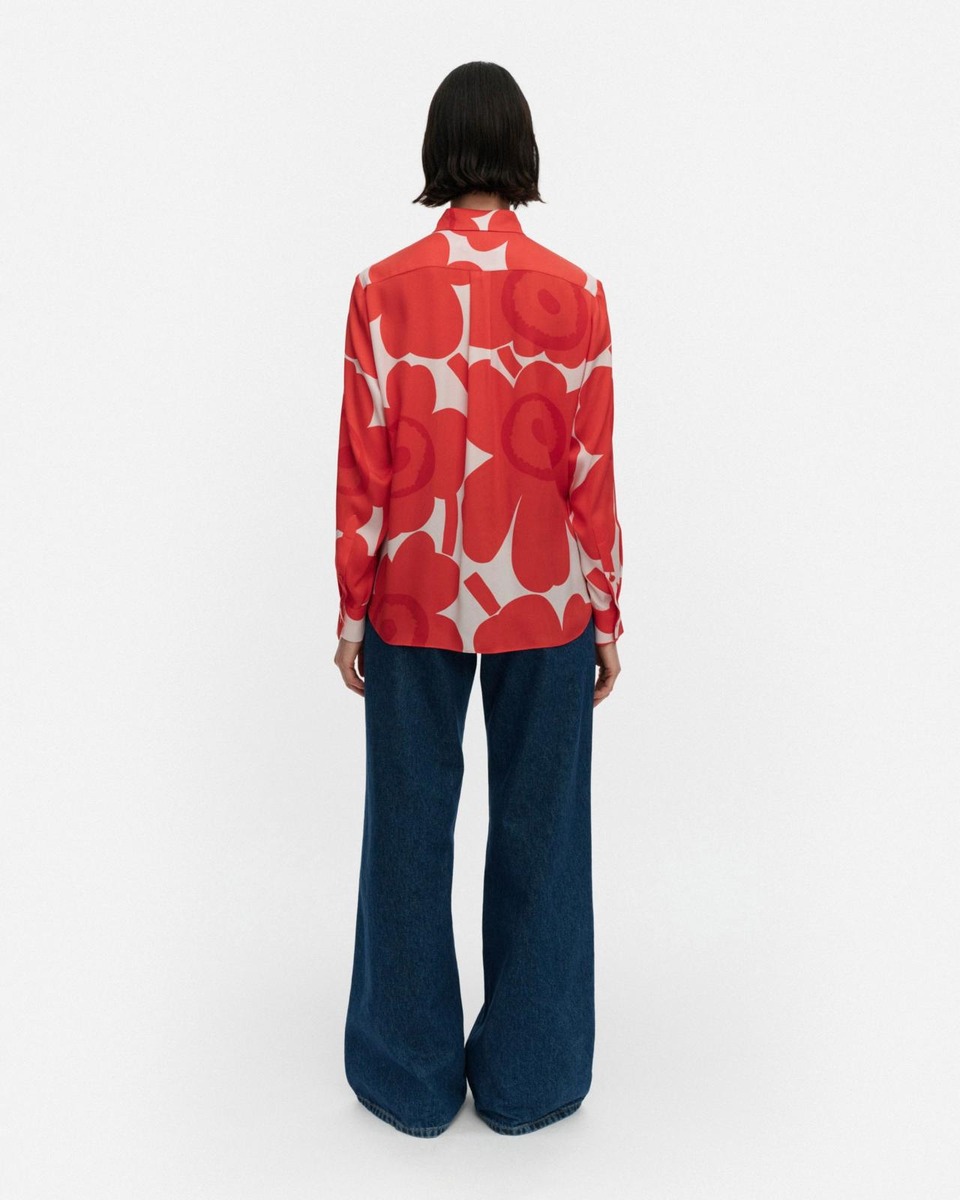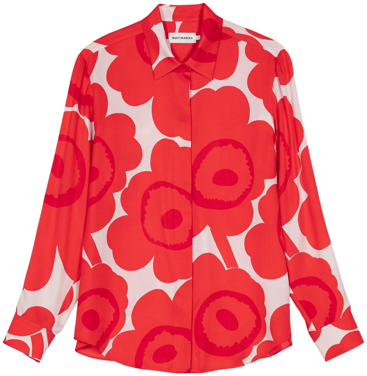 Maija-silkkikauluspaidassa on niukka istuvuus, suora leikkaus ja Unikko-kuosi. Kauluspaidassa on piilonappisuljenta ja takana selkäkaarroke sekä laskokset. Hihansuissa on halkiot ja napitettavat mansetit ja helmassa on pyöristetty leikkaus sekä sivuhalkiot.Kauluspaidat on ommeltu koko kankaan leveydestä, ja tämän vuoksi niiden ulkoasu saattaa hieman vaihdella. Jokainen tuote on yksilö.Tuotteessa on 5 % elastaania, joka lisää mukavuutta. Luovuutta ja rohkeutta symboloiva Unikko syntyi aikana, jolloin Marimekon kuviomaailmaan ei juuri kuulunut kukkia. Maija Isolaa kukka-aihe kuitenkin kiinnosti, ja hän päätti suunnitella kokonaisen sarjan uudenlaisia vahvoja kukkakuoseja.