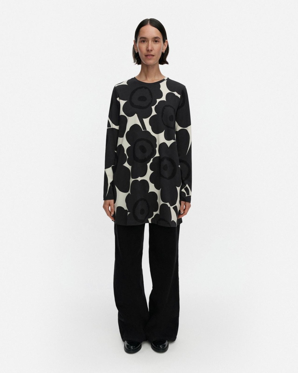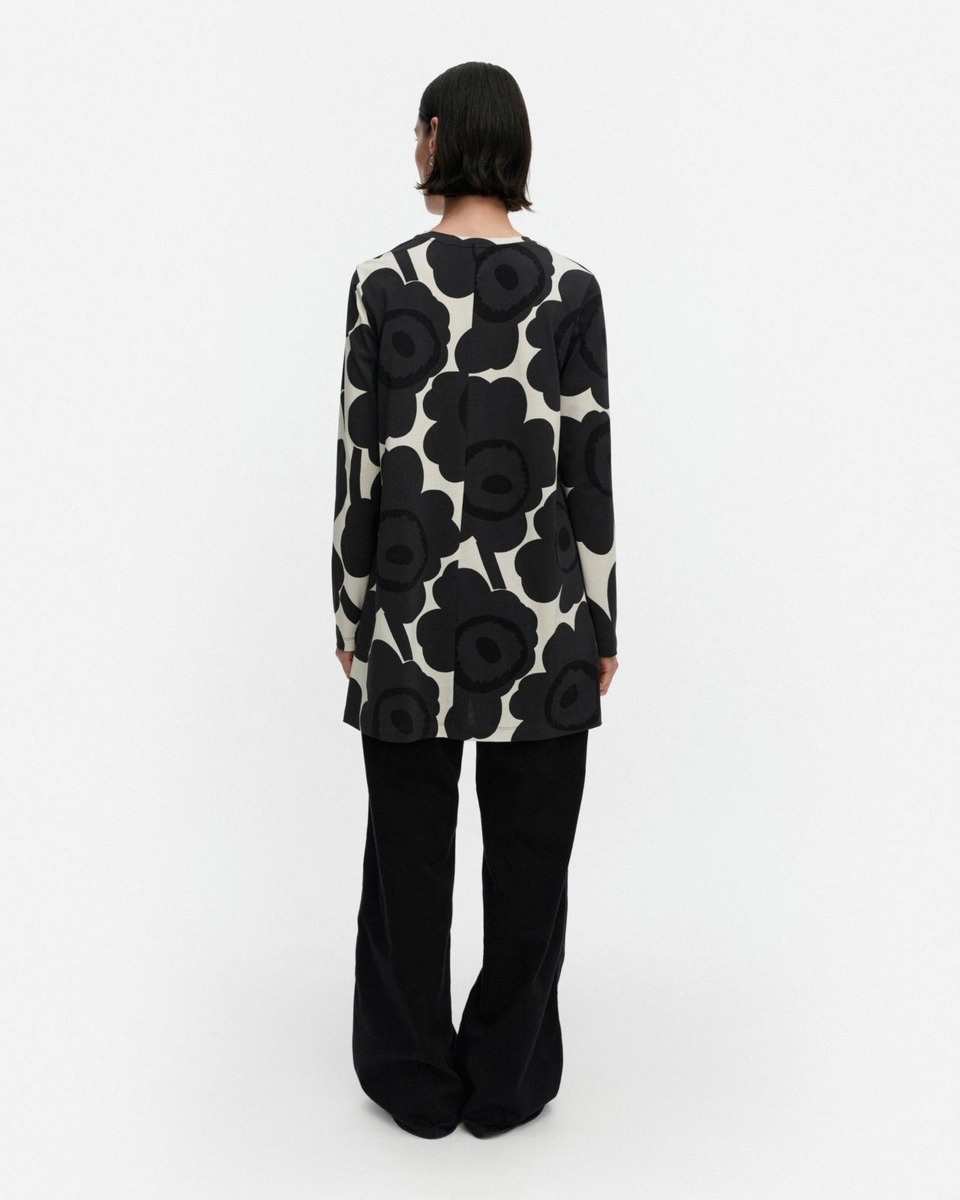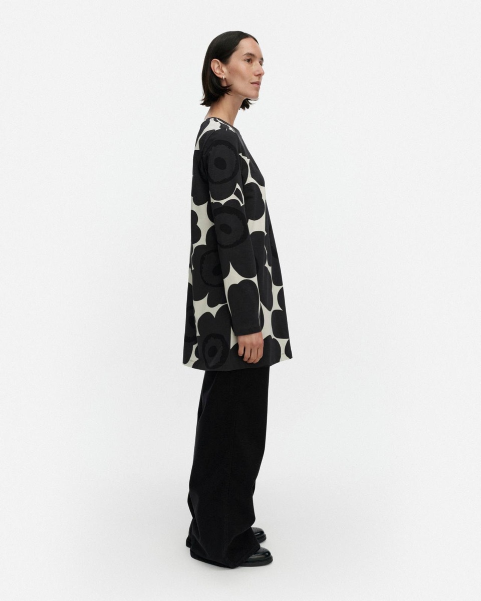 Kevät-tunika on valmistettu puuvillatrikoosta ja siinä on niukka istuvuus, A-linjainen leikkaus ja Tumma-kuosi. Tunikassa on omalla kankaalla viimeistelty pyöreä pääntie ja pitkät hihat.Tuotteessa käytetty puuvilla on luomupuuvillaa.Luovuutta ja rohkeutta symboloiva Unikko syntyi aikana, jolloin Marimekon kuviomaailmaan ei juuri kuulunut kukkia. Maija Isolaa kukka-aihe kuitenkin kiinnosti, ja hän päätti suunnitella kokonaisen sarjan uudenlaisia vahvoja kukkakuoseja.