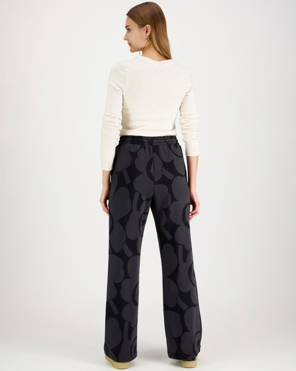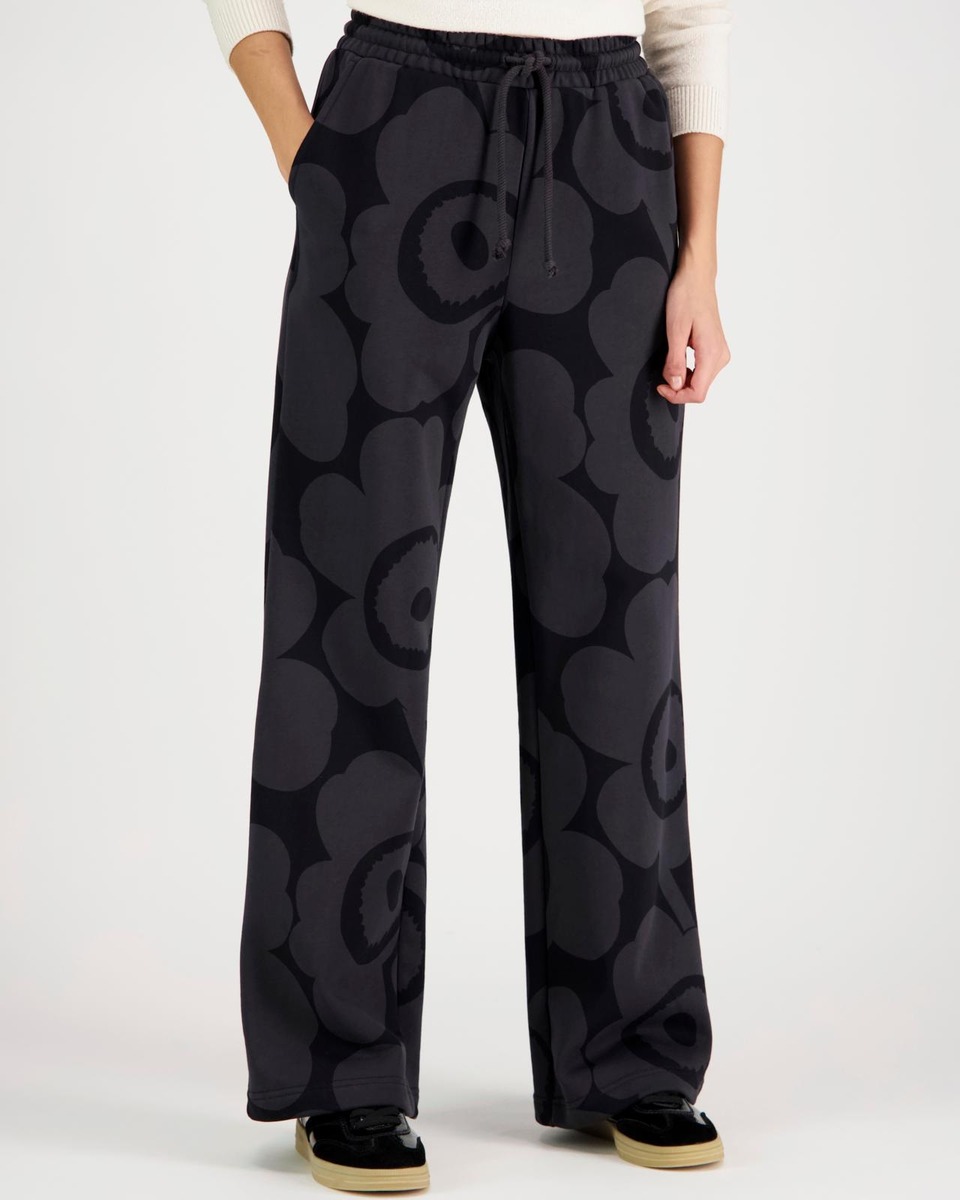 Varret-collegehousuissa on rento istuvuus ja suorat lahkeet. Housuissa on Unikko-kuosi, sivusaumataskut ja kuminauhavyötärö, jonka sisällä kulkee solmimisnauhat.Tuote on valmistettu 100-prosenttisesta luomupuuvillacollegesta.Housut on leikattu koko kankaan leveydeltä, minkä vuoksi niiden ulkoasu saattaa hieman vaihdella. Jokainen tuote on yksilö.Luovuutta ja rohkeutta symboloiva Unikko syntyi aikana, jolloin Marimekon kuviomaailmaan ei juuri kuulunut kukkia. Maija Isolaa kukka-aihe kuitenkin kiinnosti, ja hän päätti suunnitella kokonaisen sarjan uudenlaisia vahvoja kukkakuoseja.