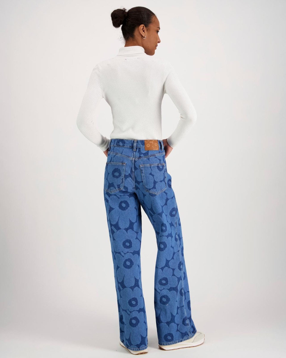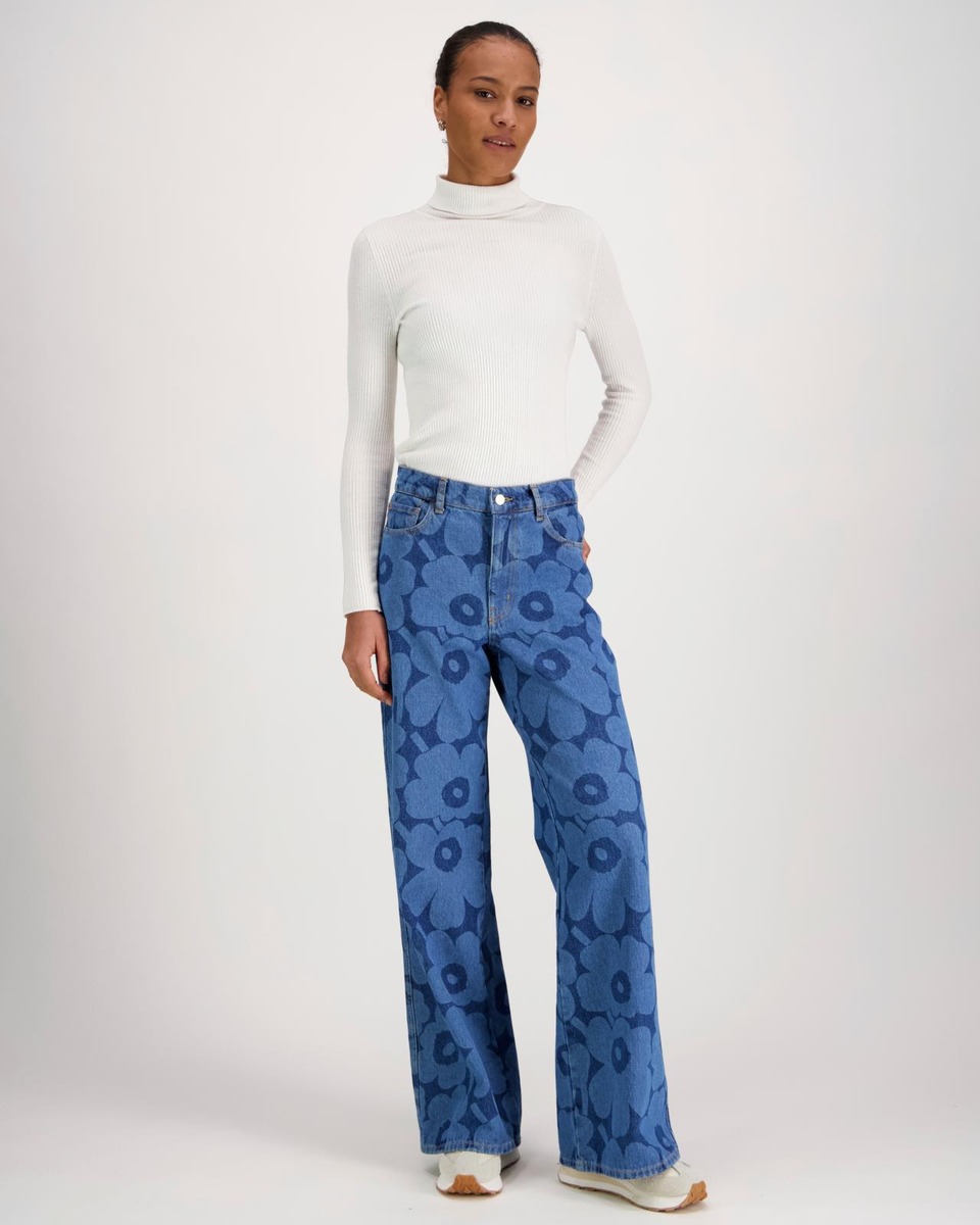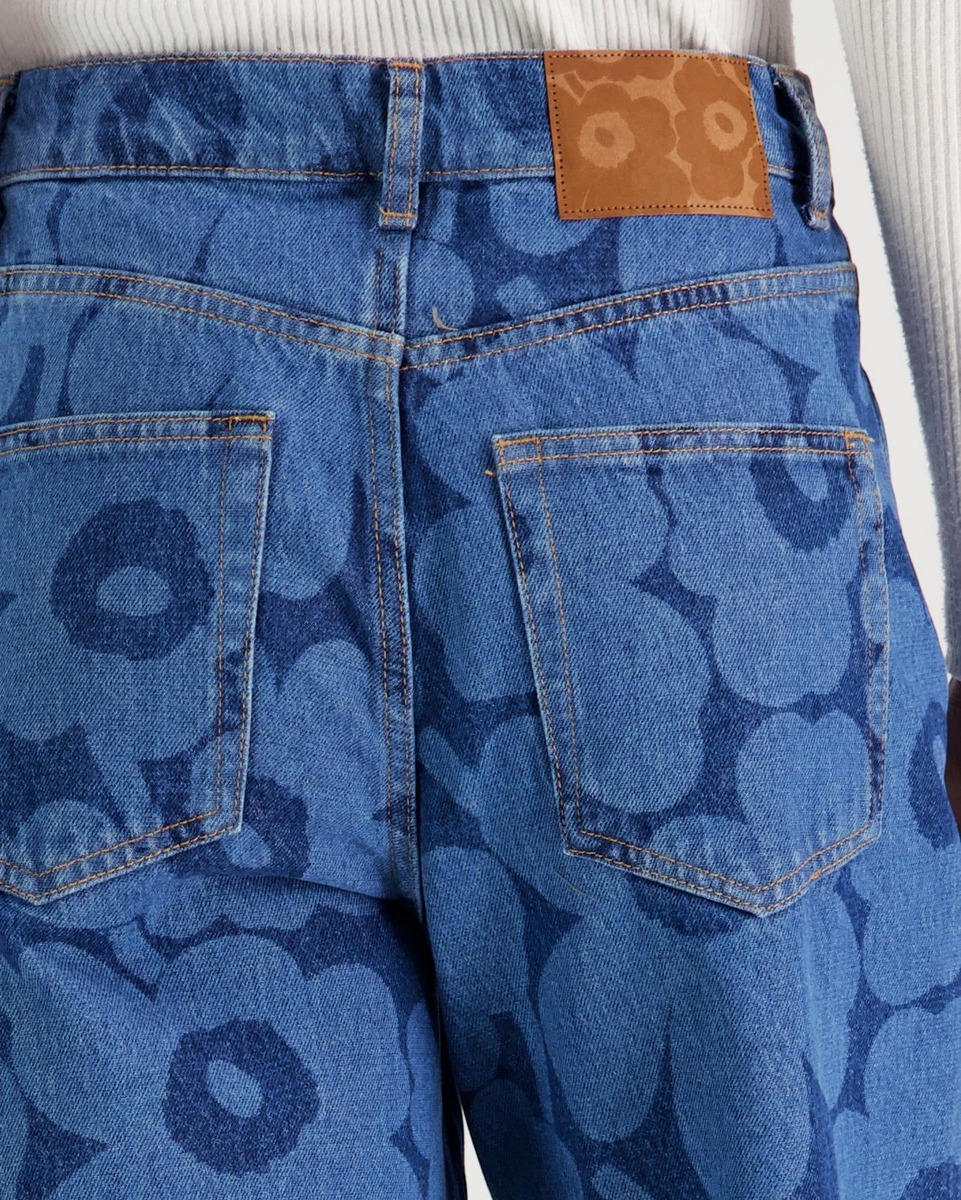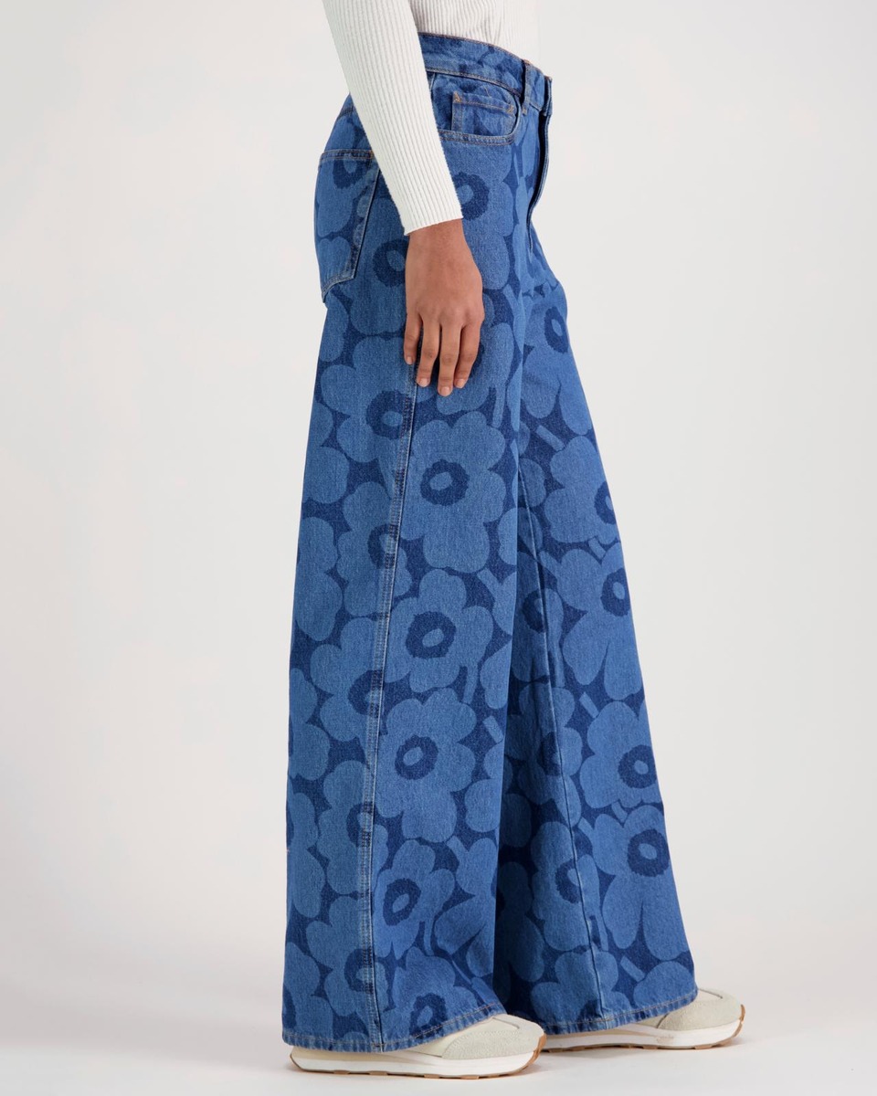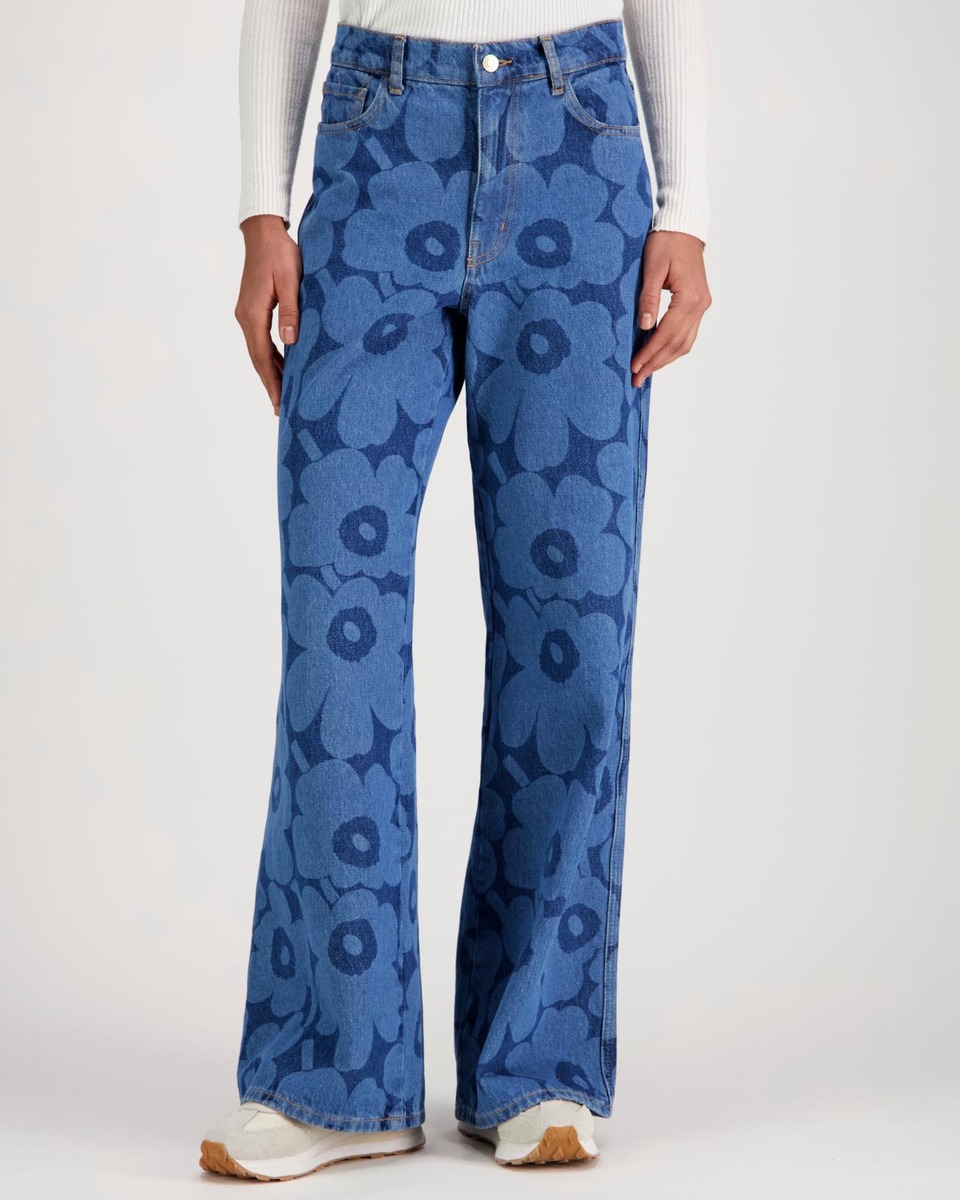 Siniset, Unikko-kuosiset Maridenim Wide -farkut on valmistettu puuvillakankaasta, joka ei sisällä elastaania. Farkut ovat 5-taskumallia ja niissä on korkea, istuva vyötärö ja leveät, täyspitkät lahkeet. Farkuissa on Marimekko-farkkunapit ja Marimekko-farkkumerkki takana, joka on valmistettu FSC-sertifioidusta jacron-materiaalista.Maridenim tuotteissa on erityinen viimeistely ja patina, jotka antavat tuotteille ainutlaatuisen, yksilöllisen ilmeen. Tämä ominaisuus on osa Maridenim-tuotteiden viehätystä ja kiinnostavuutta.Marimekko Maridenim -tuotteet on suunniteltu noudattaen kiertotaloutta edistävän Ellen MacArthur -säätiön Jeans Redesign -ohjeita. Ohjeiden mukaisesti farkkumateriaali on täyttä puuvillaa (80 % luomupuuvillaa ja 20 % kierrätettyä puuvillaa) eikä sisällä elastaania. Lisäksi tuotteissa ei käytetä ylimääräisiä metalliosia ja napit ovat irrotettavia. Myös tuotteiden pesu, viimeistely ja kemikaalien käyttö noudattavat ohjeita, ja tuotteiden värisävyjen, kuvioiden ja halutun tunnun tuottamiseen käytämme muun muassa lasertekniikkaa, E-Flow-höyrypesua sekä otsonipesua emmekä esimerkiksi perinteistä kivipesua.Luovuutta ja rohkeutta symboloiva Unikko syntyi aikana, jolloin Marimekon kuviomaailmaan ei juuri kuulunut kukkia. Maija Isolaa kukka-aihe kuitenkin kiinnosti, ja hän päätti suunnitella kokonaisen sarjan uudenlaisia vahvoja kukkakuoseja.