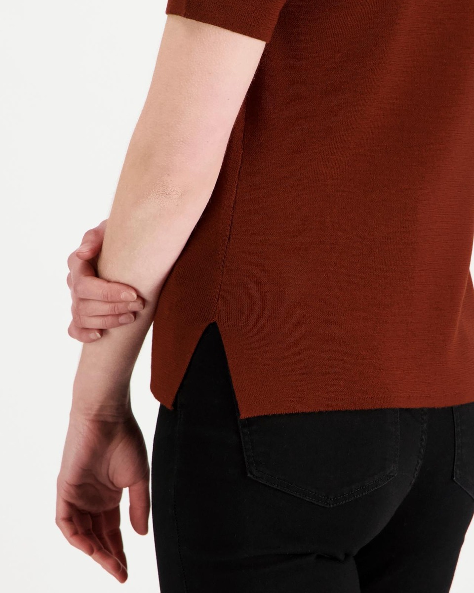 Merinovillaisessa Elea-neulepaidassa on pyöreä pääntie, lyhyet hihat ja normaali istuvuus. Sivussa metallinen Aarikan a-logo. Hartiasta helmaan mitattuna pituus koossa S on 60 cm. Suunniteltu Suomessa