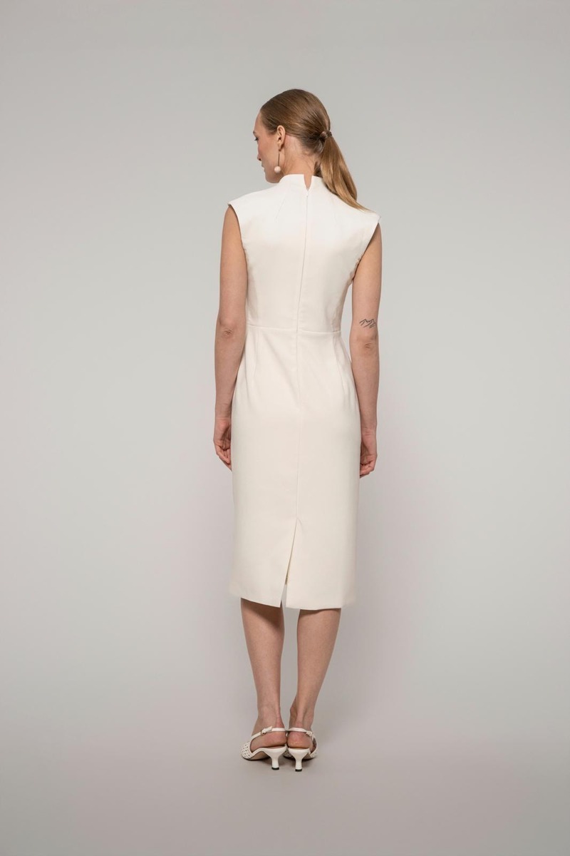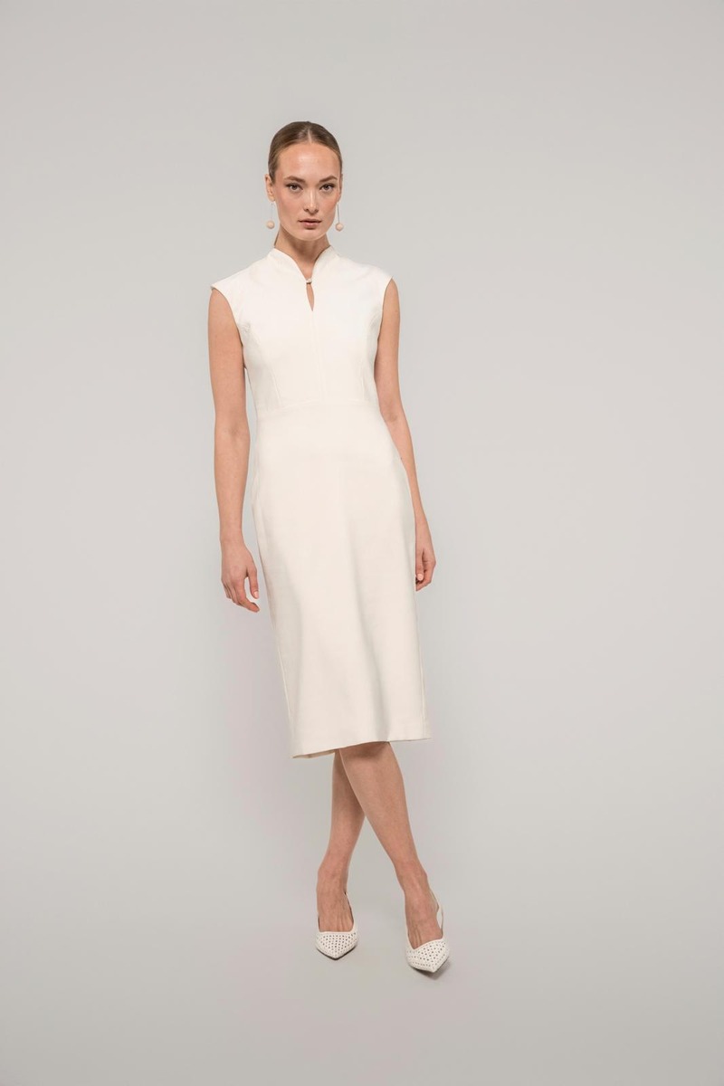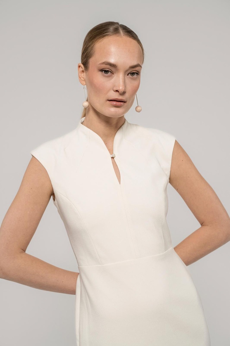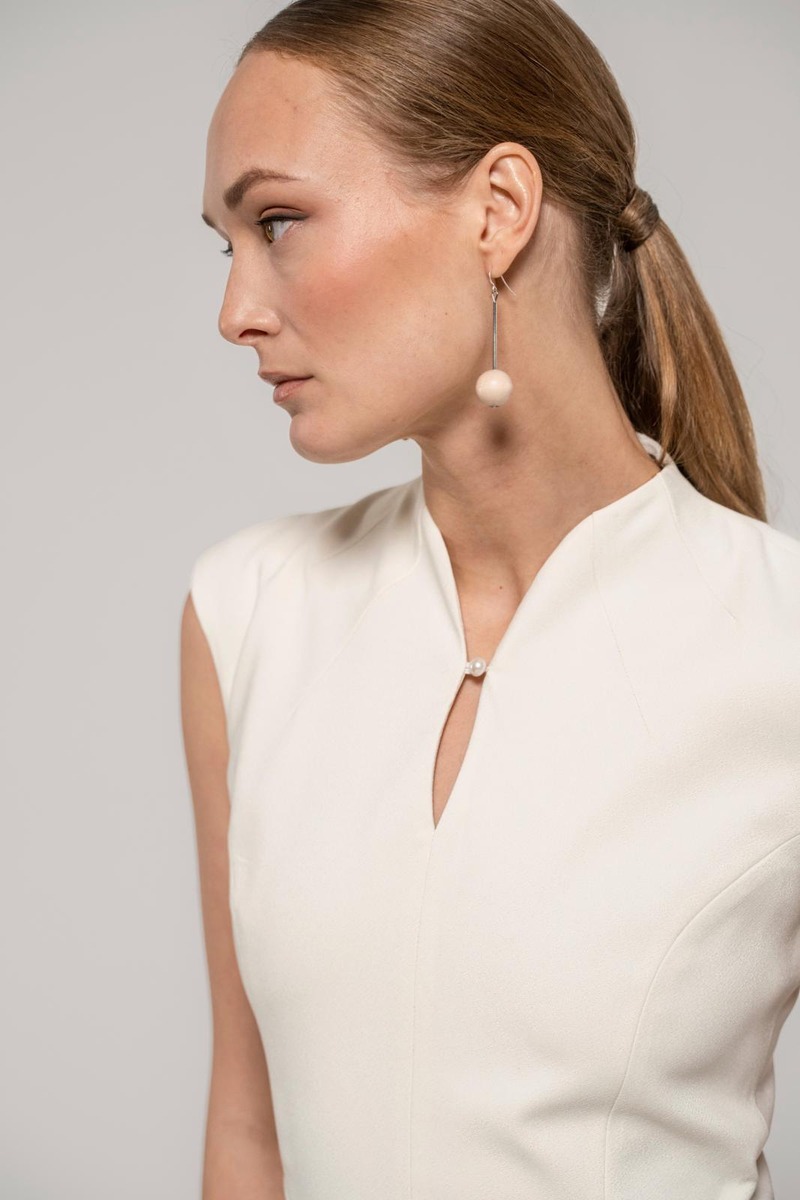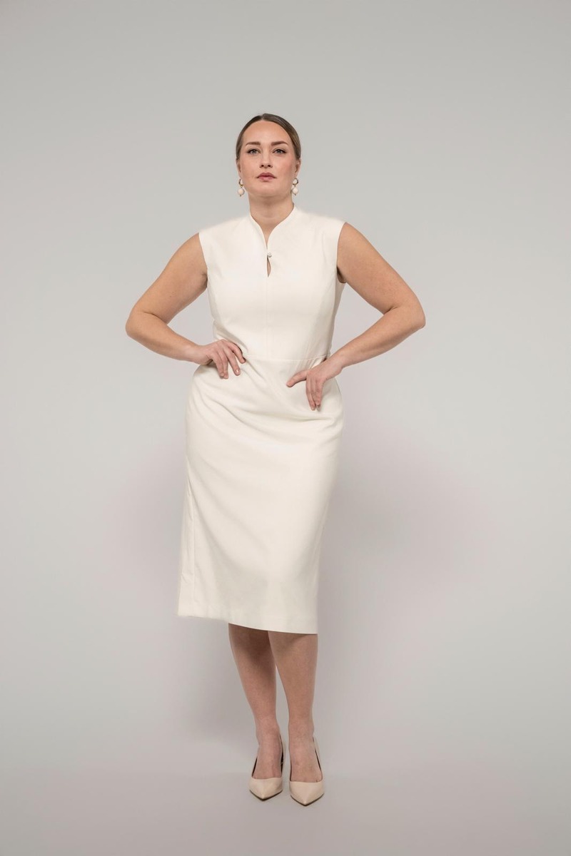 Hienostuneessa, vartalonmyötäisessä Muusa-mekossa on korkea pääntie pienellä halkiolla ja nappikiinnityksellä. Hihaton mekko saa ryhtiä takana olevasta halkiosta ja piilovetoketjusta. Pituus hartialta helmaan koossa 36 on 115 cm. Suunniteltu Suomessa.