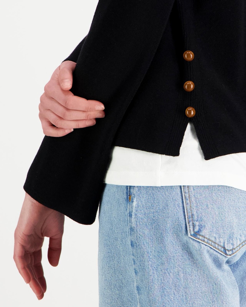 Merinovillasta valmistetussa A-linjaisessa Blanka-neuletakissa on pyöreä pääntie, piilotettu nappikiinnitys edessä ja 7/8-pituiset raglanhihat. Neuletakin sivuilla on helmikoristeet ja metallinen Aarikan a-logo. Hartiasta helmaan mitattuna pituus koossa S on 58 cm. Suunniteltu Suomessa.