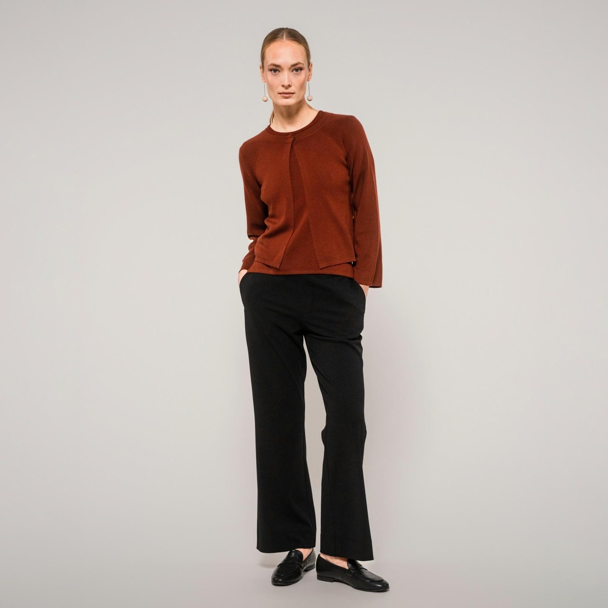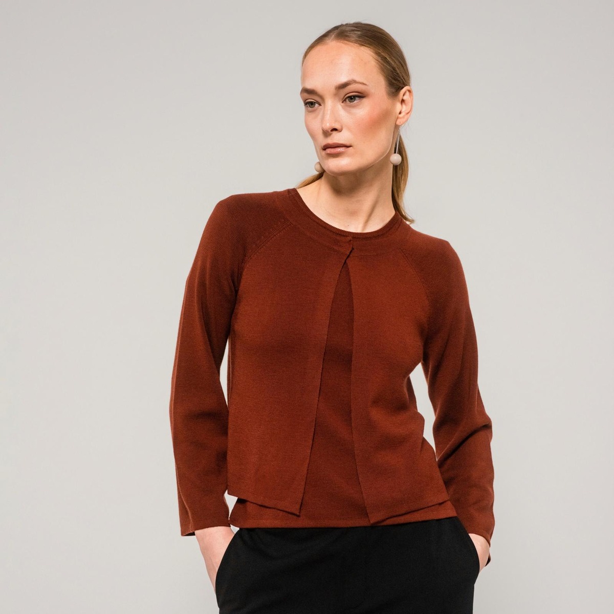 Merinovillasta valmistetussa A-linjaisessa Blanka-neuletakissa on pyöreä pääntie, piilotettu nappikiinnitys edessä ja 7/8-pituiset raglanhihat. Neuletakin sivuilla on helmikoristeet ja metallinen Aarikan a-logo. Hartiasta helmaan mitattuna pituus koossa S on 58 cm. Suunniteltu Suomessa.