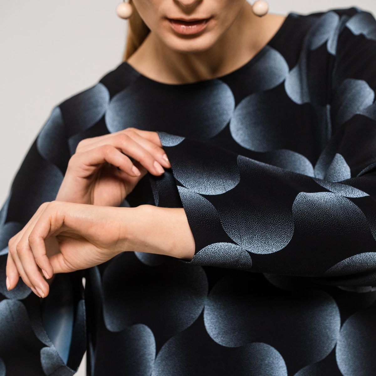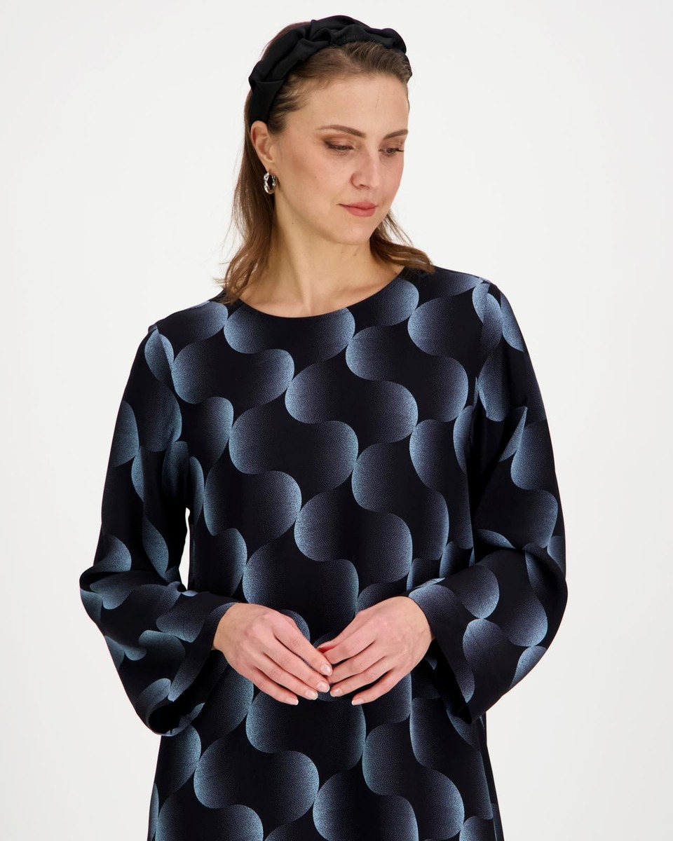 Nebula-kuosisessa Fresia-mekossa on väljä istuvuus, pyöreä pääntie ja 7/8-pituiset hihat. Mekon materiaali on miellyttävää viskoosia. Olkapäästä helmaan mitattuna pituus koossa 36 on 100 cm. Suunniteltu Suomessa.