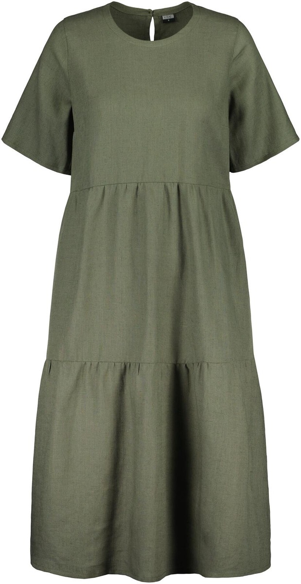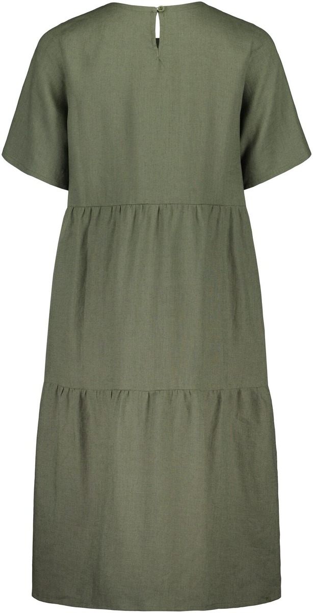 Midimittainen väljä malli. Lyhyet hihat, vyötäröllä sekä helmassa rypytetty leikkaus. Niskassa halkio ja nappi. Sivusaumoissa taskut.