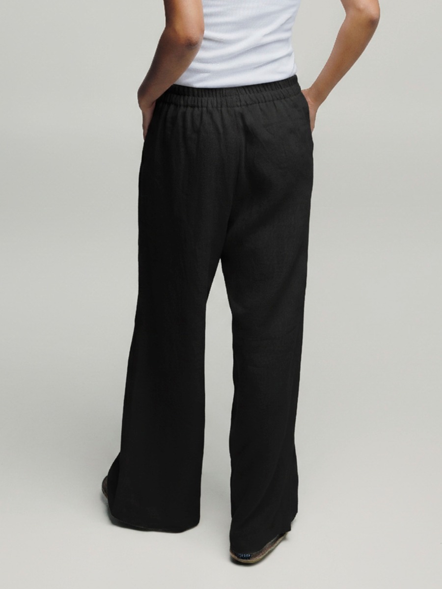 Pehmeästä pellavakankaasta valmistetut naisten rennot housut. Suorat pitkät lahkeet. Kuminauhavyötärö sekä viistot sivutaskut.