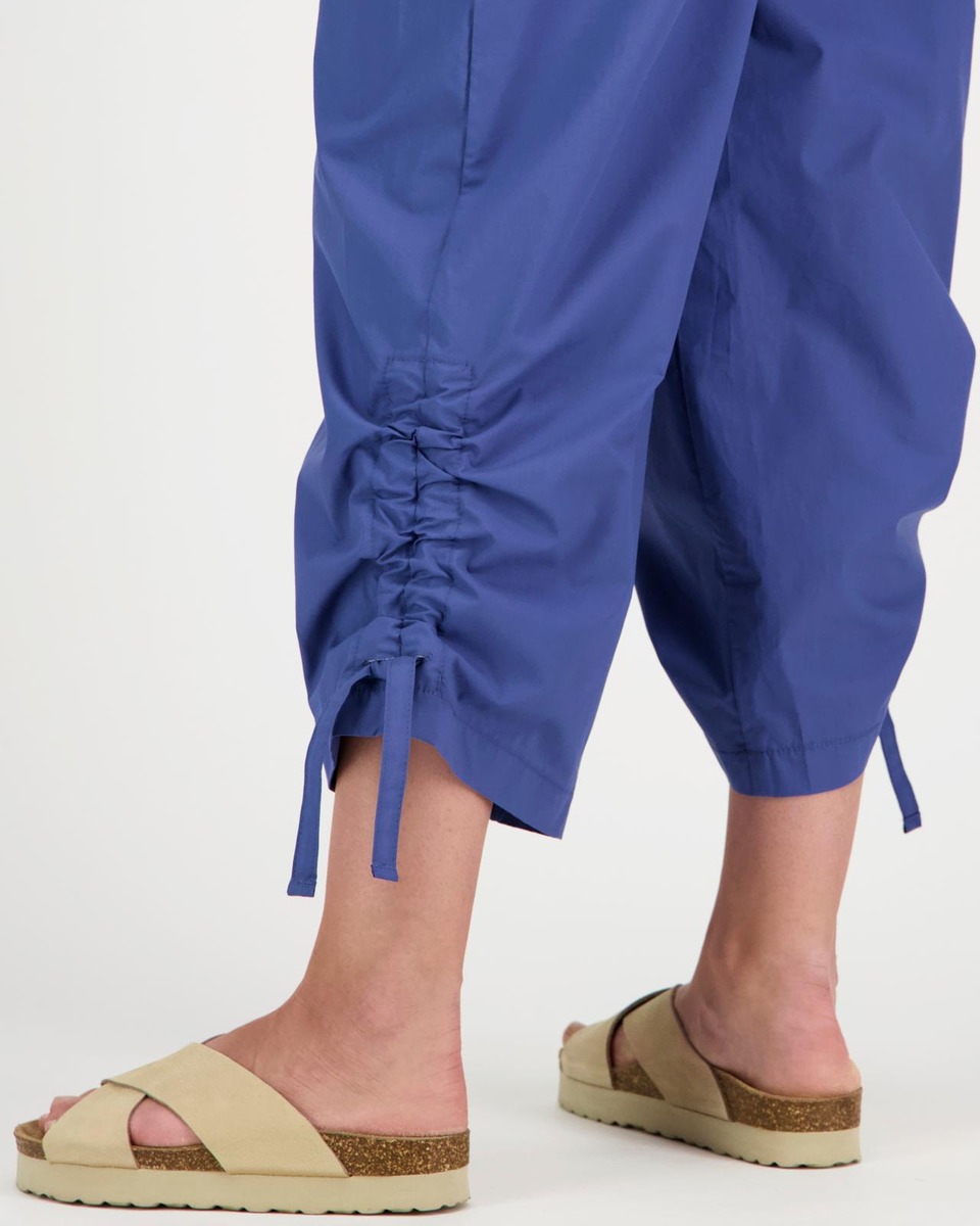 Puuvillapopliinista valmistetut naisten rennot housut. Kuminauhavyötärö nyörillä sekä valevetoketjuhalkio edessä. Listataskut edessä. Vajaa mitta. Lahkeensuussa nyörit, joilla pituutta voi säätää.
