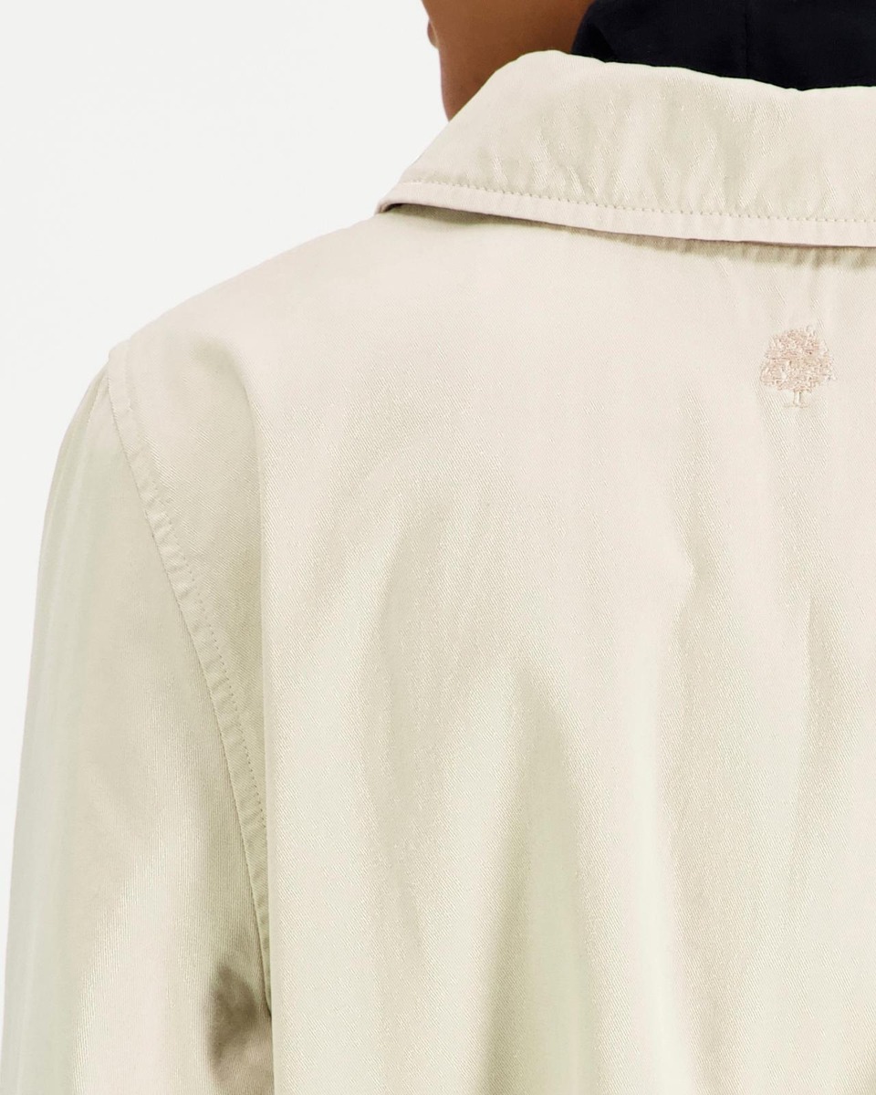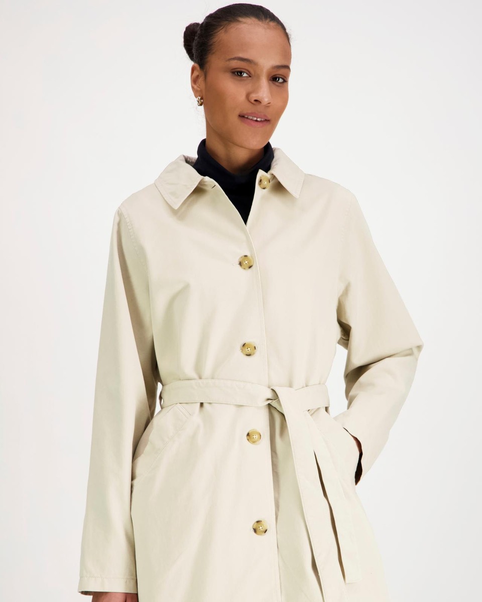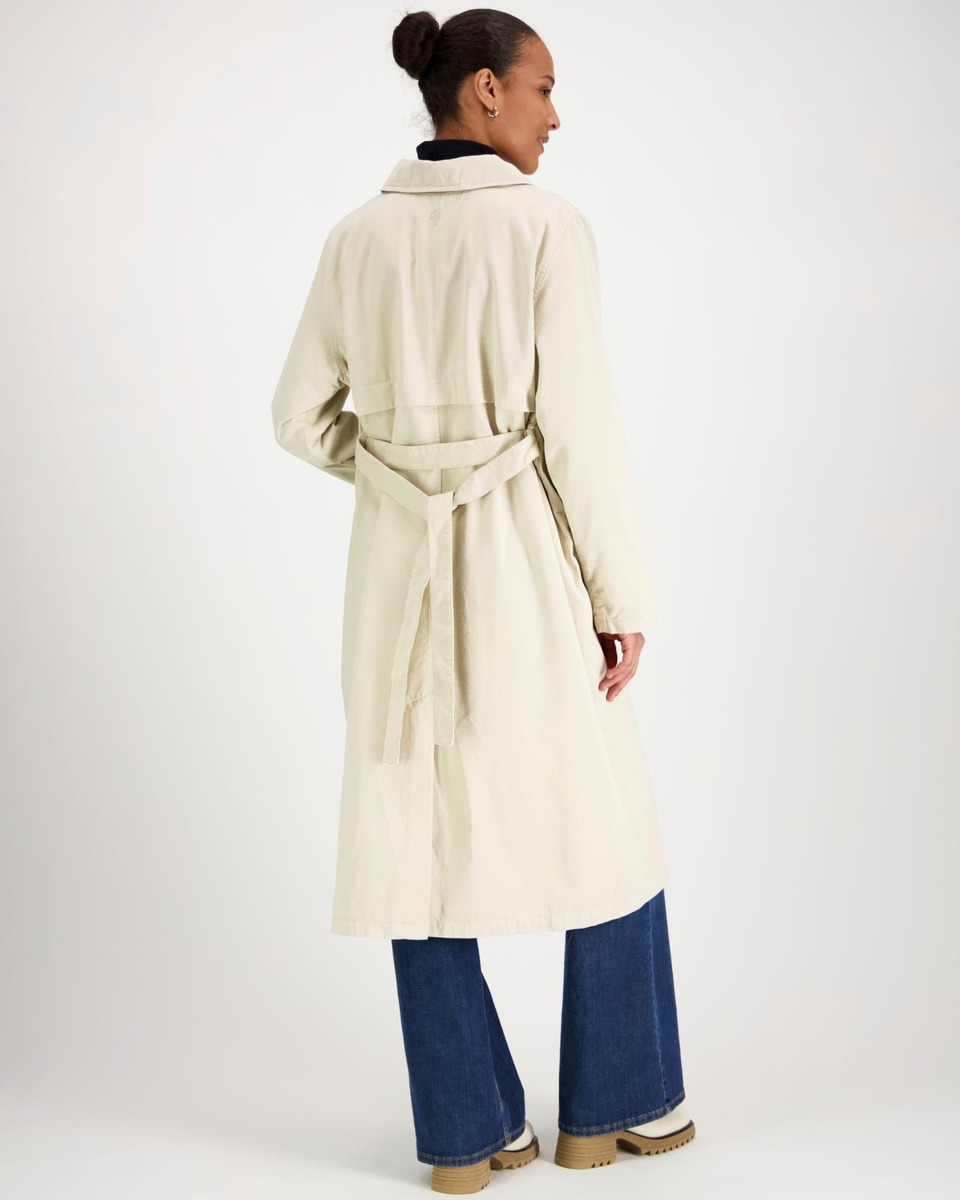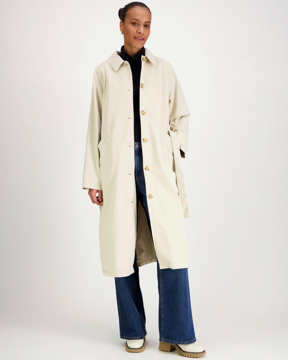 Suositun Tuulikki-trenssin uudistettu puuvillakankainen versio. Väljä mitoitus ja kevyt vuori. Kaulukset, nappikiinnitys ja leveä solmittava irtovyö. Pitkät suorat hihat, hihansuissa kääntövara. Viistot taskut, selässä takakaarroke ja helmassa halkio. Niskassa brodeerattu puu-logo.