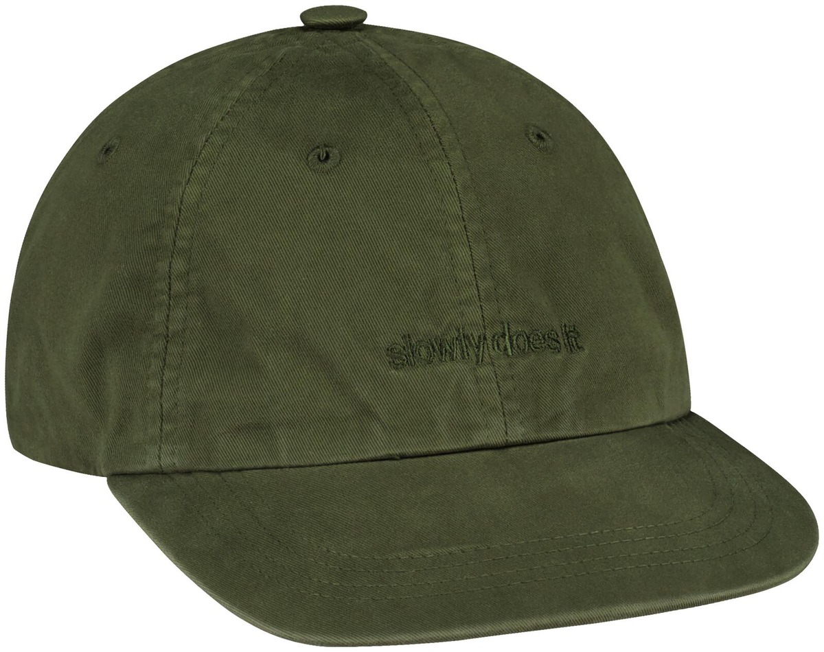 Miesten mitoituksella tehty 6-paneelilippis. Slowly does it -brodeeraus edessä. Takana metallisolkinen säätötamppi.