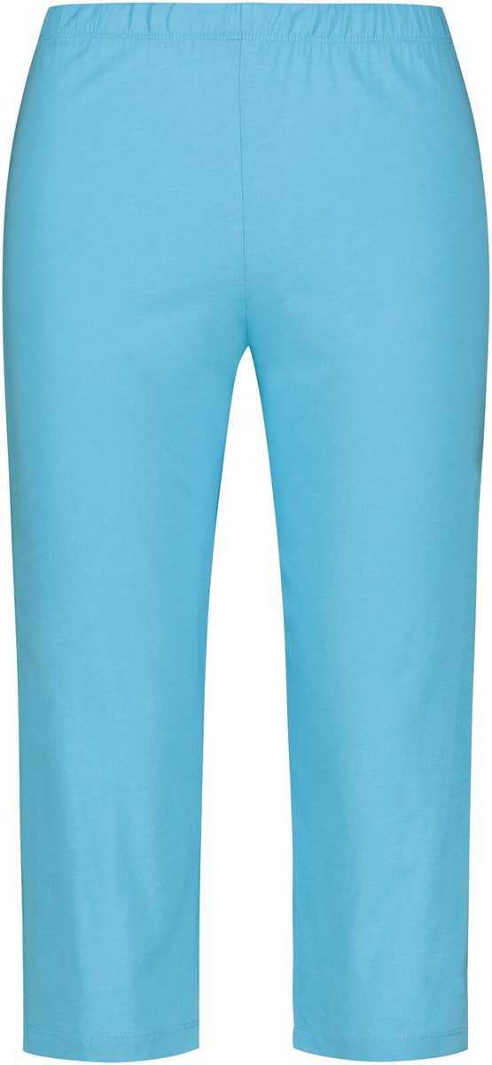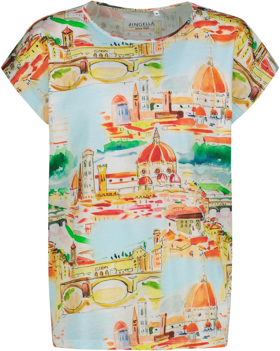 Holkkihihainen pyjama, caprihousu, yläosassa "kaupunkimaisema" kuosi, housut yksiväriset