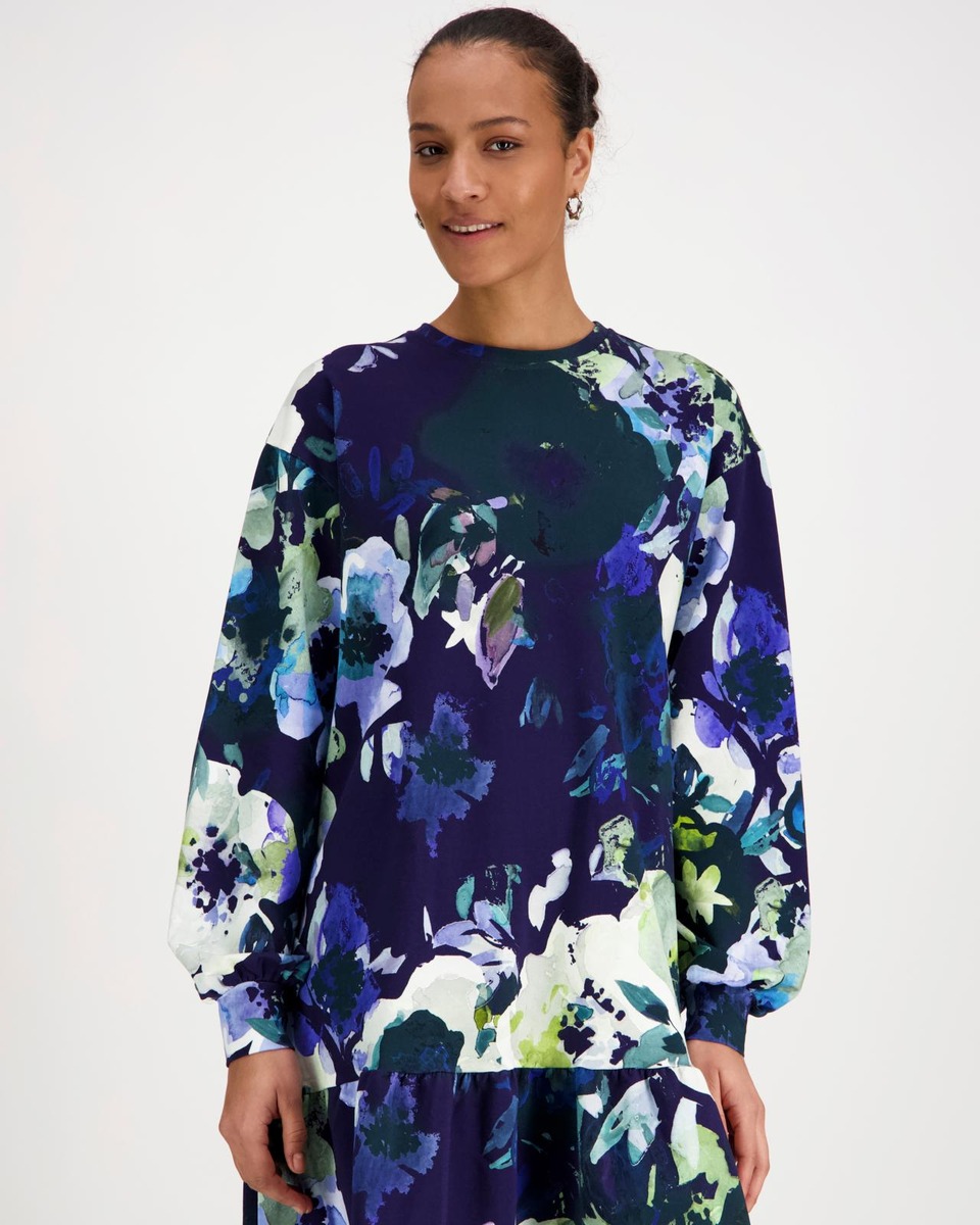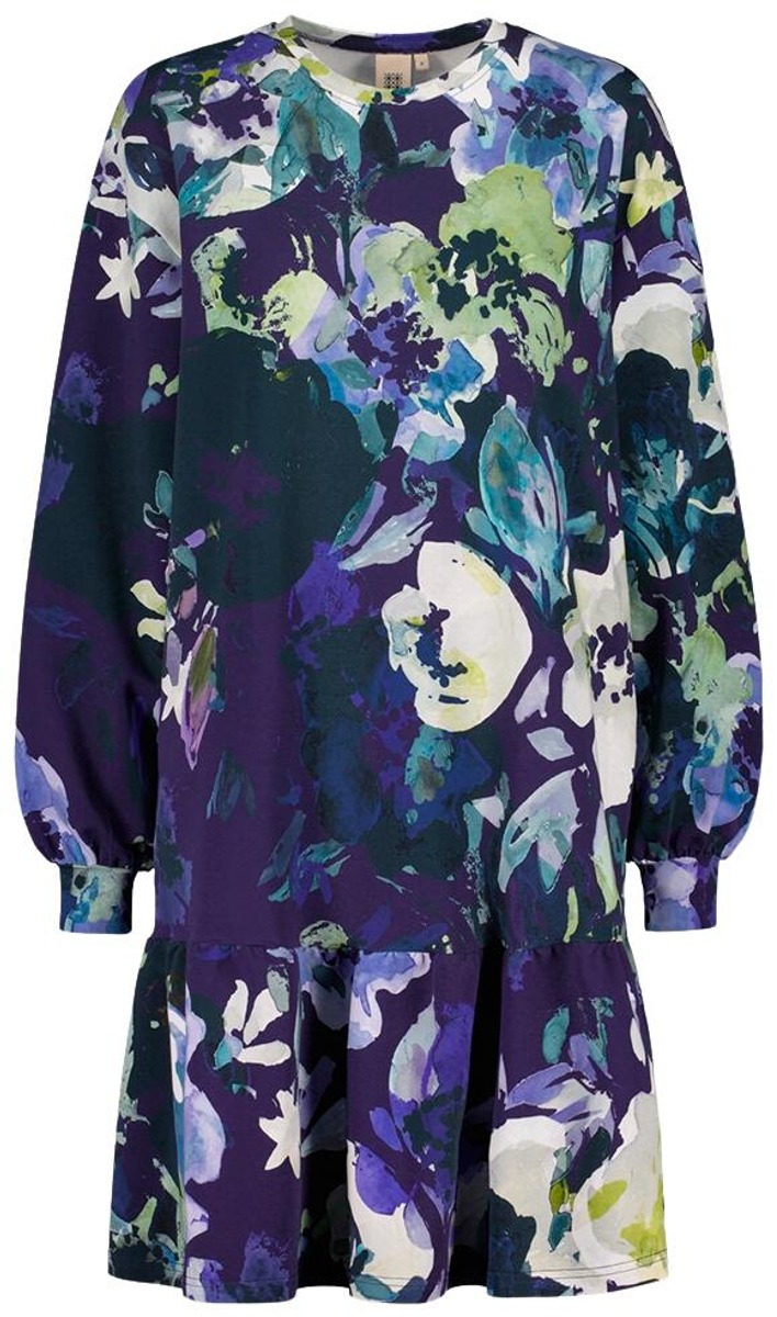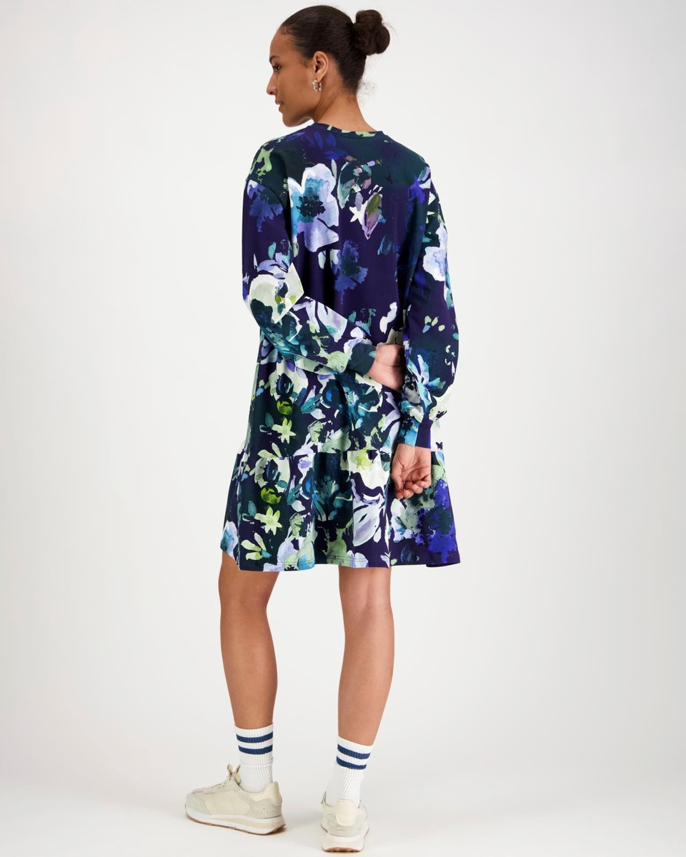 Rento ja mukava naisten mekko - Ruffle Sweatshirt Dress on valmistettu korkealaatuisesta luomupuuvillaisesta joustocollegesta, joka tuntuu ihanan pehmeältä päällä.