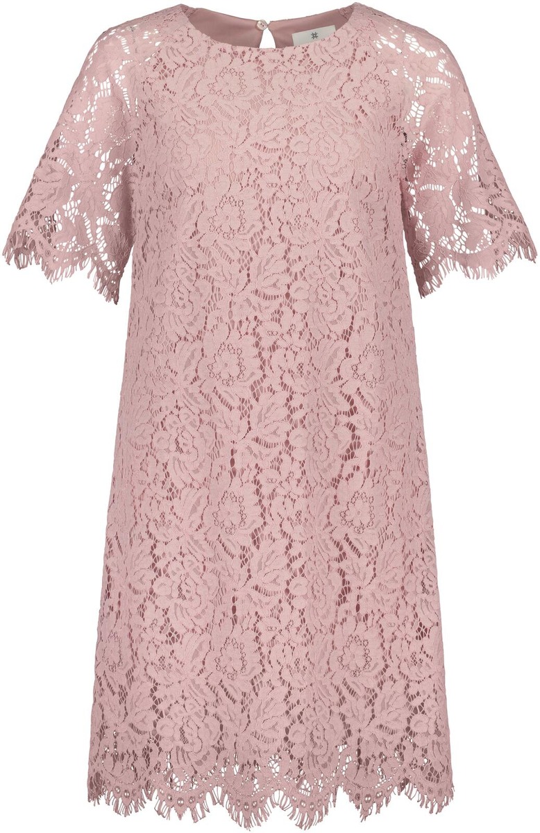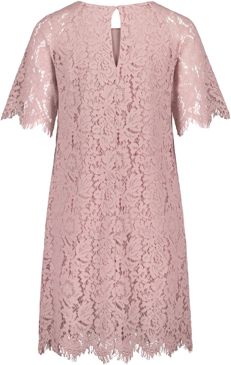 Aventuran ajattoman tyylikäs polvipituinen pitsimekko, jossa lyhyet vuorittomat hihat. Hihansuissa ja helmassa kaunis reuna. Mekossa vuori ja takana niskassa avattava nappikiinitys. Koossa 38 mekon rinnanympärys noin 96 cm ja pituus olalta helmaan noin 98 cm.