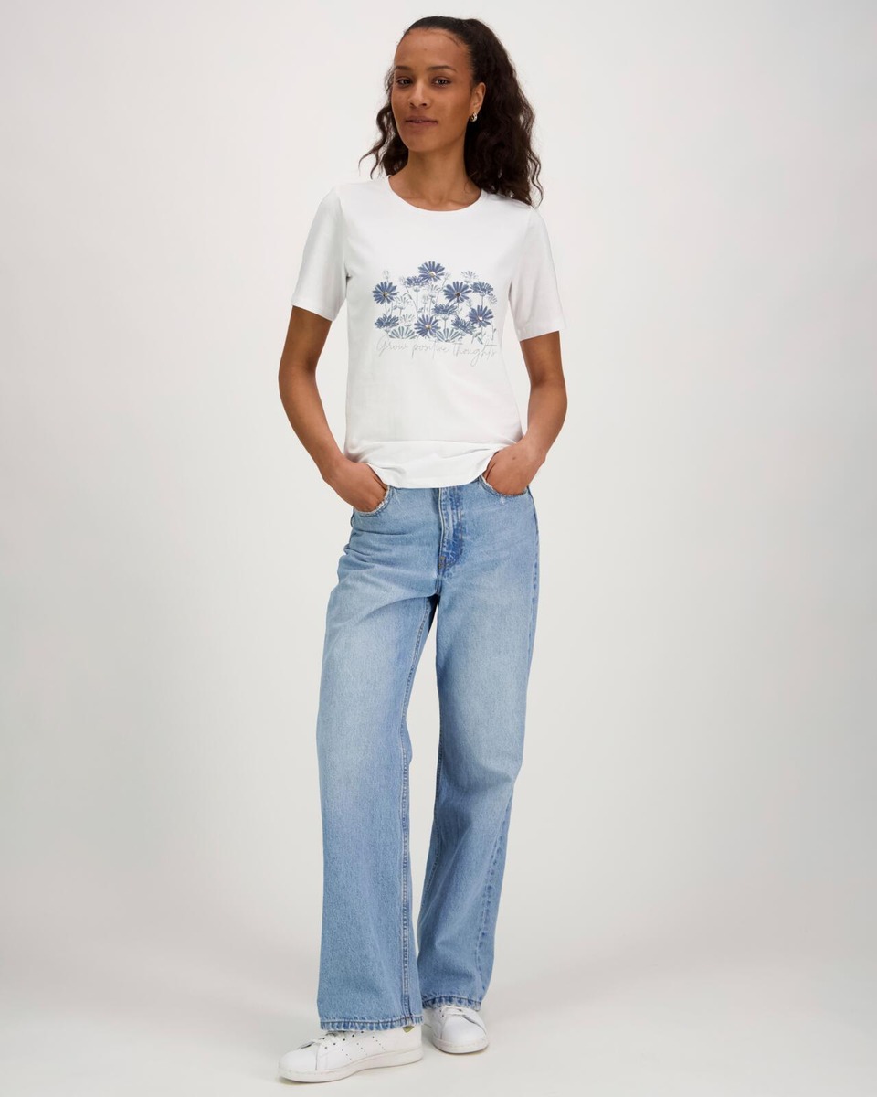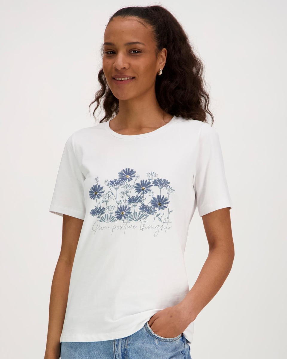 Aventuran t-paita etuprintillä, jossa yksityiskohtina brodeerausta sekä paljetteja. Koossa M rinnanympärys 92 cm ja pituus olalta helmaan noin 64 cm. Materiaali miellyttävää ja hieman joustavaa puuvilla-elastaania.