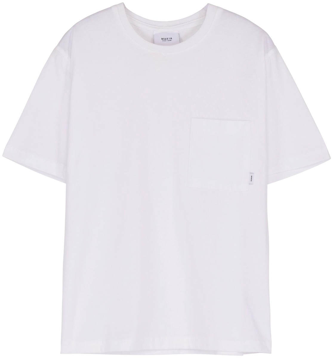 Taskullinen t-paita, jossa on hillitty Makia-logo taskussa.