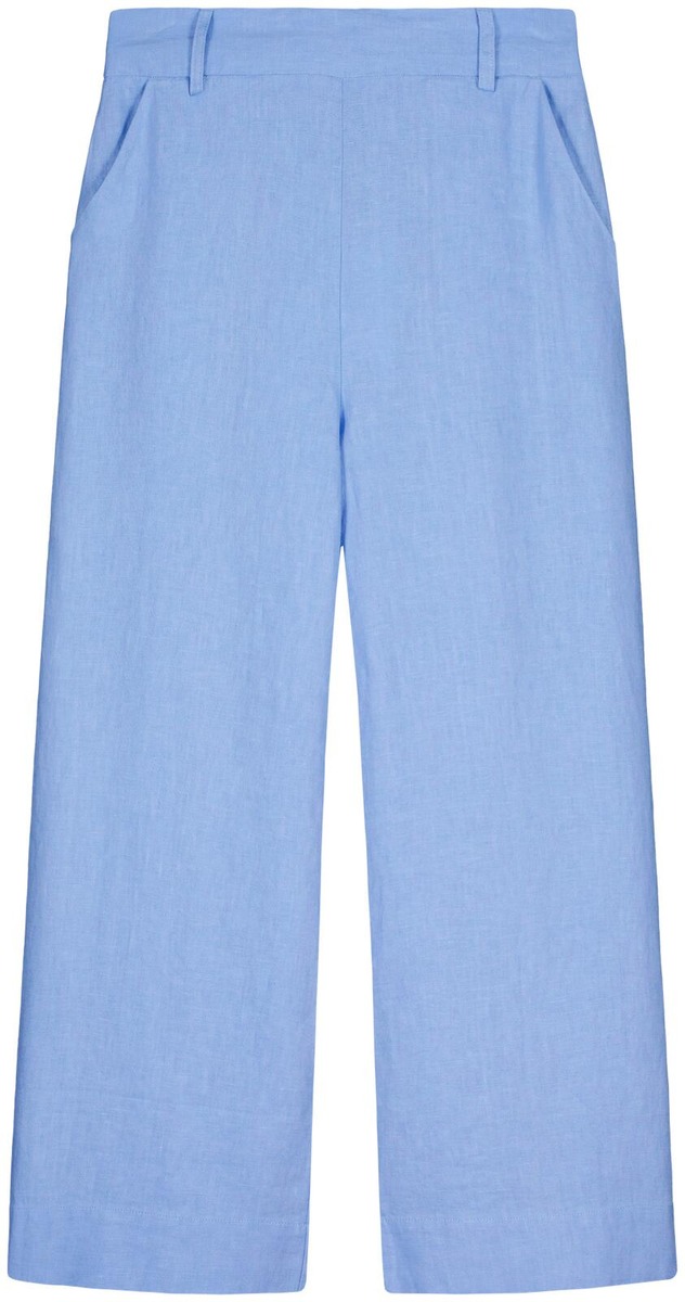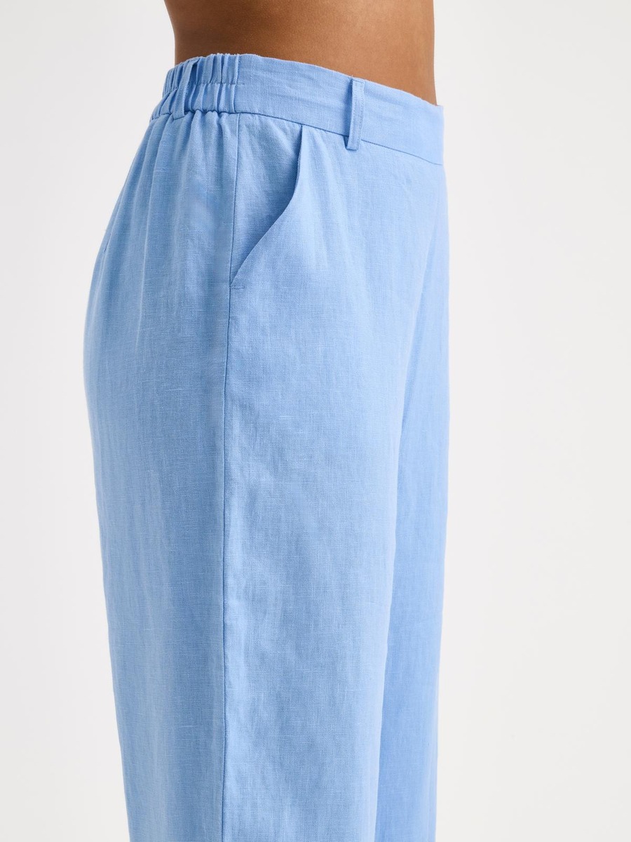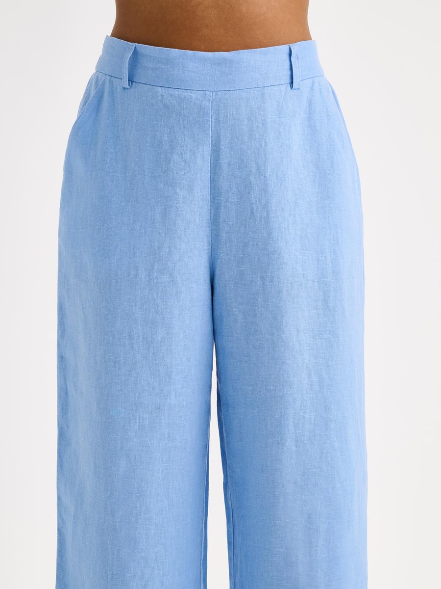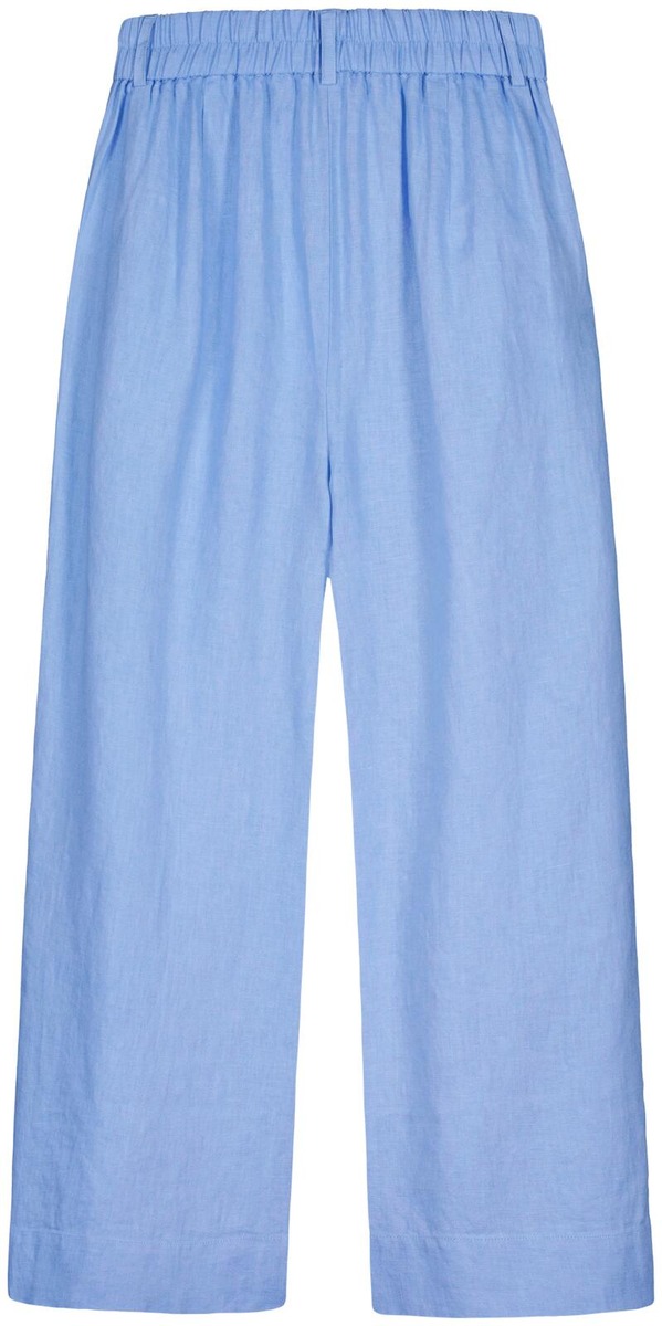 Naisten yksiväriset Saari-housut. Housuissa on takaa joustava vyötärörakenne ja sivuissa taskut. 7/8 pituisissa housuissa on leveä käänne lahkeensuissa. Housujen lahkeen sisäpituus koossa 38 on noin 65 cm. Materiaali on kudottua pellavakangasta, joka on kestävää ja hengittävää. Pellavalle on ominaista luonnollinen pieni rypistyminen. Tuote on esipesty tuotannossa, joten se ei kutistu ensimmäisessä pesussa.