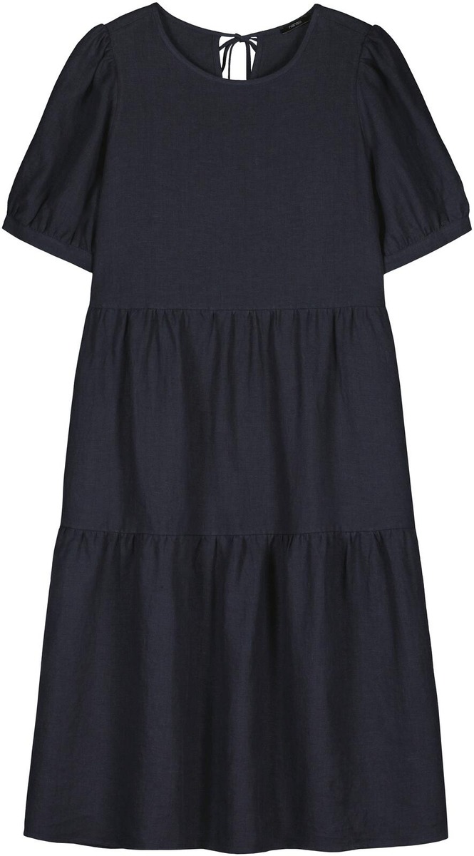 Naisten kaunis Sarastus-mekko volyymisilla frillakerroksilla ja lyhyillä puhvihihoilla, joissa on napit säätövaralla. Mekossa on sivutaskut, pyöreä pääntie sekä niskassa pieni halkio ja solmittavat nyörit. Mekon pituus koossa M on noin 113 cm. Materiaali kudottua pellavakangasta, joka on kestävää ja hengittävää. Pellavalle on ominaista luonnollinen pieni rypistyminen. Tuote on esipesty tuotannossa, joten se ei kutistu ensimmäisessä pesussa.
