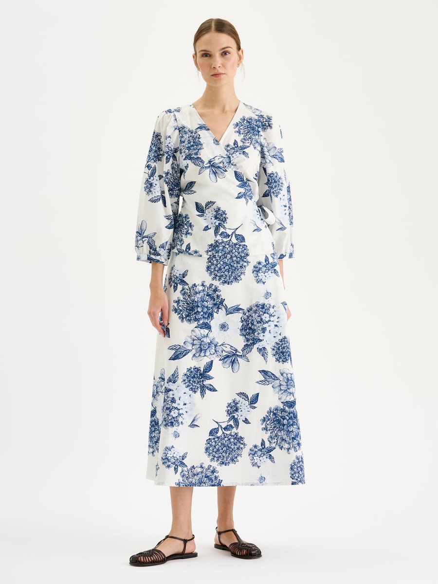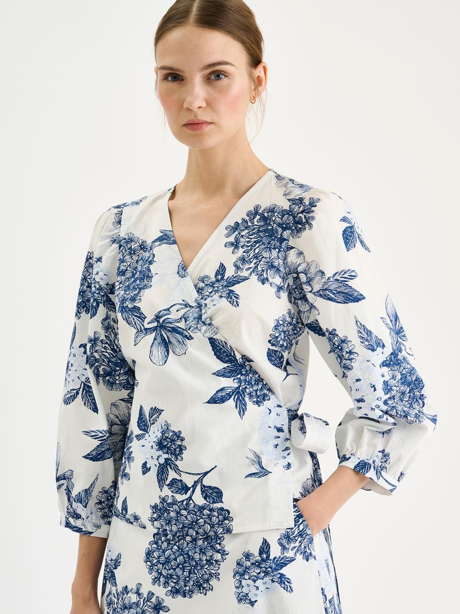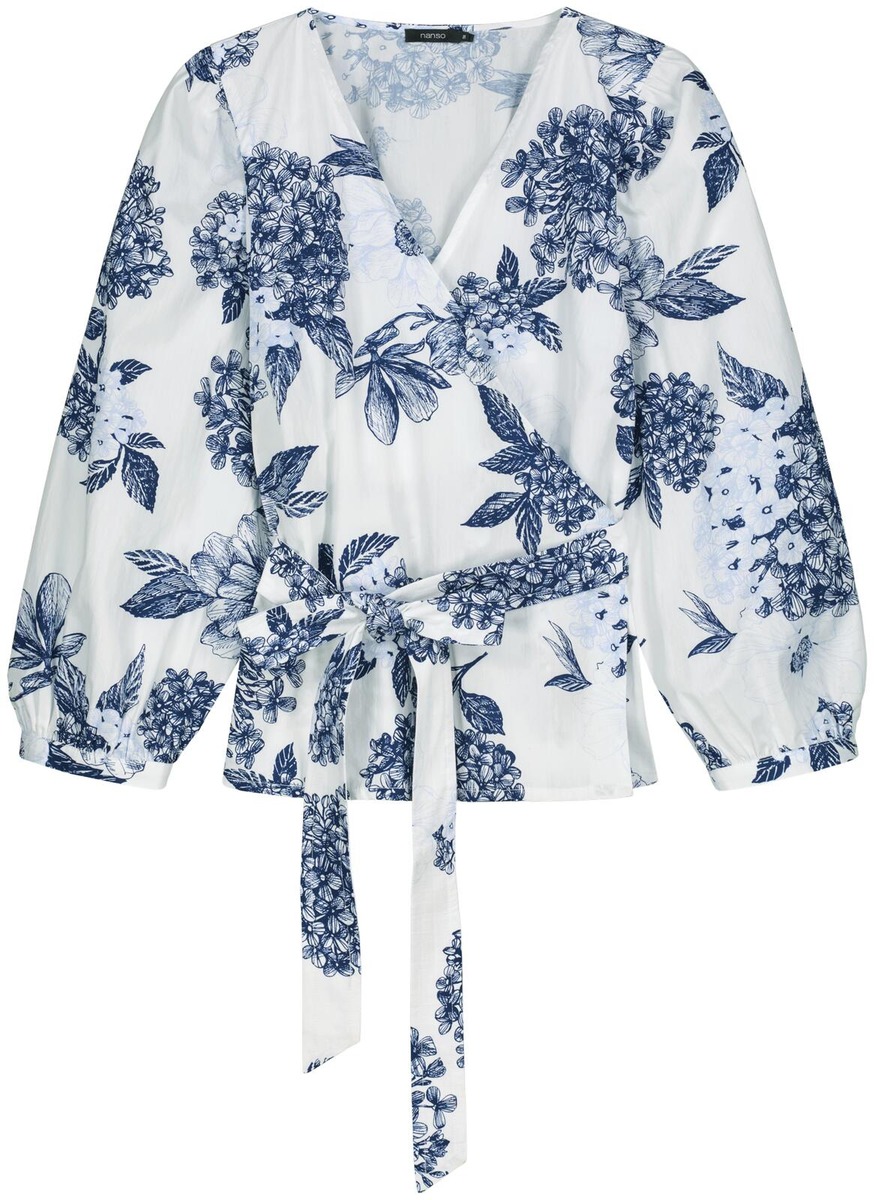 Naisten kuosillinen Palatsi-kietaisupusero. Puserossa on kaunis, näyttävä kukkakuosi. Puserossa on kantilla viimeistelty v-pääntie ja kiinteä vyö. Puserossa on runsaat 3/4 pituiset hihat, jotka poimuttuvat kauniisti hihansuun kaitaleen yläpuolelta sekä olalta. Puseron helma on suora. Puseron pituus koossa 38 on noin 58 cm. Materiaali on kevyttä, mutta ryhdikästä puuvilla-popliinia. Materiaalille on ominaista 3-5% kutistuminen ensimmäisessä pesussa.