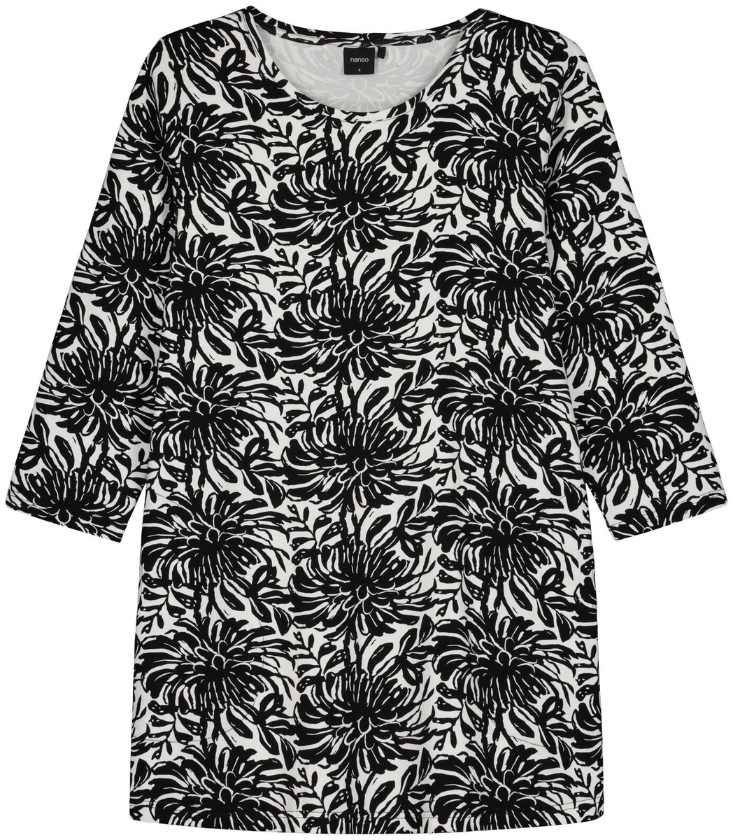 Naisten kuosillinen Safiiri-tunika. Tunikassa on tereellä viimeistelty pyöreä pääntie, sivuissa taskut ja 3/4 pituiset hihat. Tunikan pituus koossa M on noin 80 cm. Materiaali on miellyttävän tuntuista ja helppohoitoista puuvilla-elastaani-neulosta.