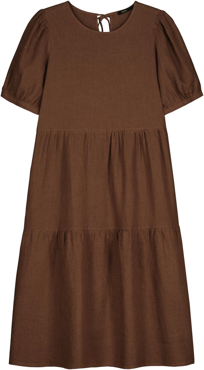 Naisten kaunis Sarastus-mekko volyymisilla frillakerroksilla ja lyhyillä puhvihihoilla, joissa on napit säätövaralla. Mekossa on sivutaskut, pyöreä pääntie sekä niskassa pieni halkio ja solmittavat nyörit. Mekon pituus koossa M on noin 113 cm. Materiaali kudottua pellavakangasta, joka on kestävää ja hengittävää. Pellavalle on ominaista luonnollinen pieni rypistyminen. Tuote on esipesty tuotannossa, joten se ei kutistu ensimmäisessä pesussa.