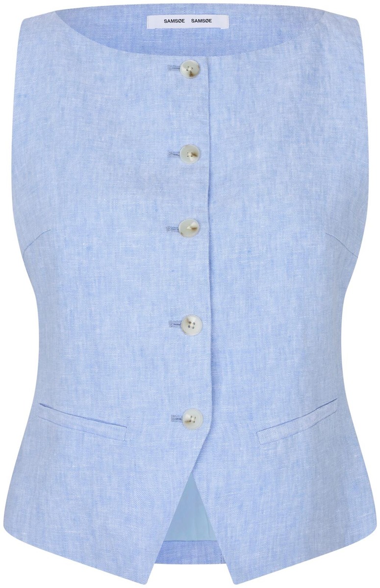 Samsøe Samsøen klassisen sininen pellavaliivi on täydellinen lisä kesäiseen pukeutumiseen. Valmistettu hengittävästä ja kevyestä pellavasta, se tuo mukavuutta ja tyylikkyyttä lämpimiin päiviin. Edessä oleva napitus ja venepääntie tekevät liivistä kauniin ja helposti yhdisteltävän – olipa kyseessä rento arkipäivä tai huoliteltu juhlatyyli. Yhdistä esimerksiksi Samsøe Samsøen Satoves pellavahousujen kanssa.