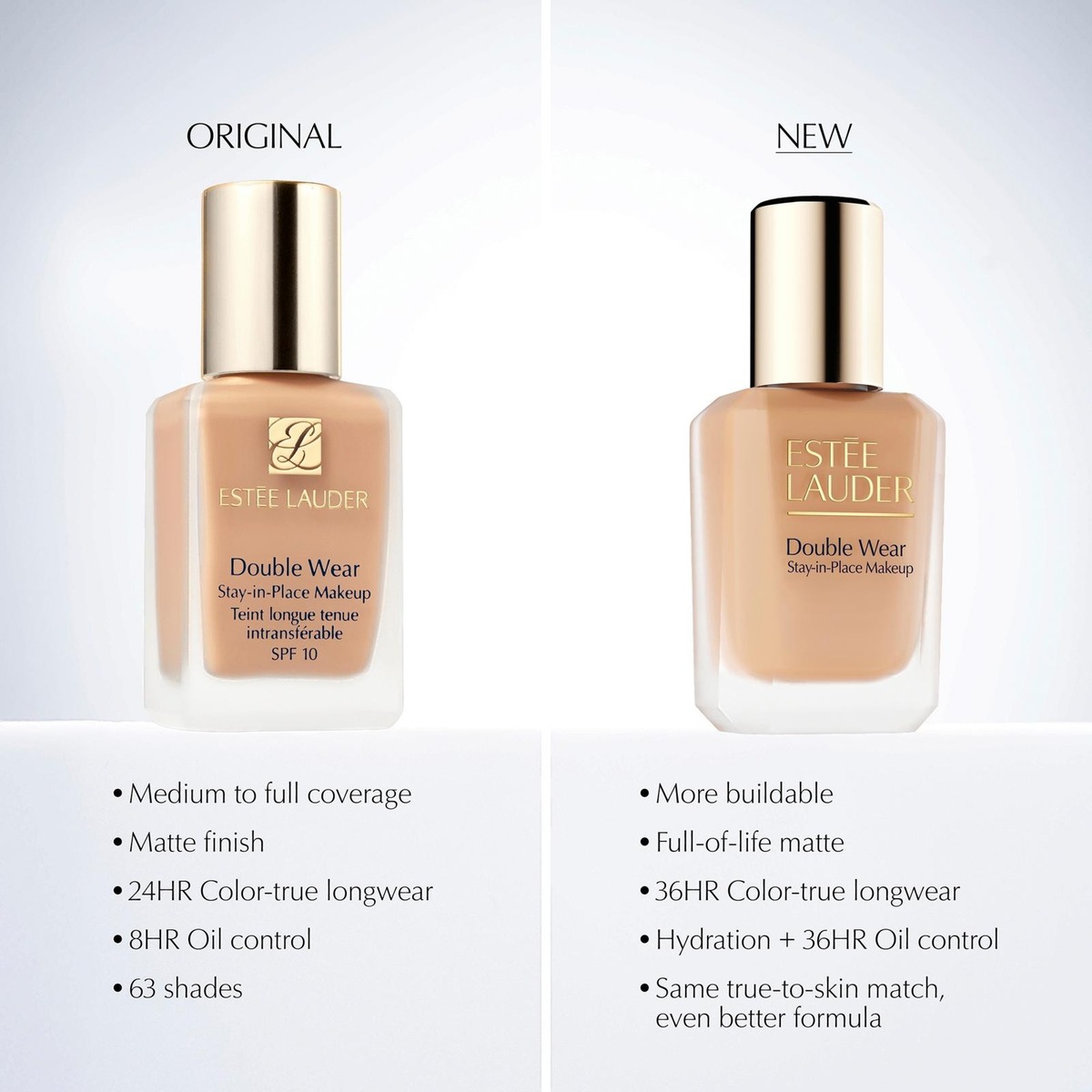 Jos olet jo Double Wear ?fani, voit odottaa samaa täydellisesti ihoon sulautuvaa värisävyä entistä paremmassa koostumuksessa. Kuten aina uuden koostumuksen kohdalla, suosittelemme silti tarkistamaan sävyn uudelleen – saatat löytää sinulle entistä paremmin sopivan sävyn.