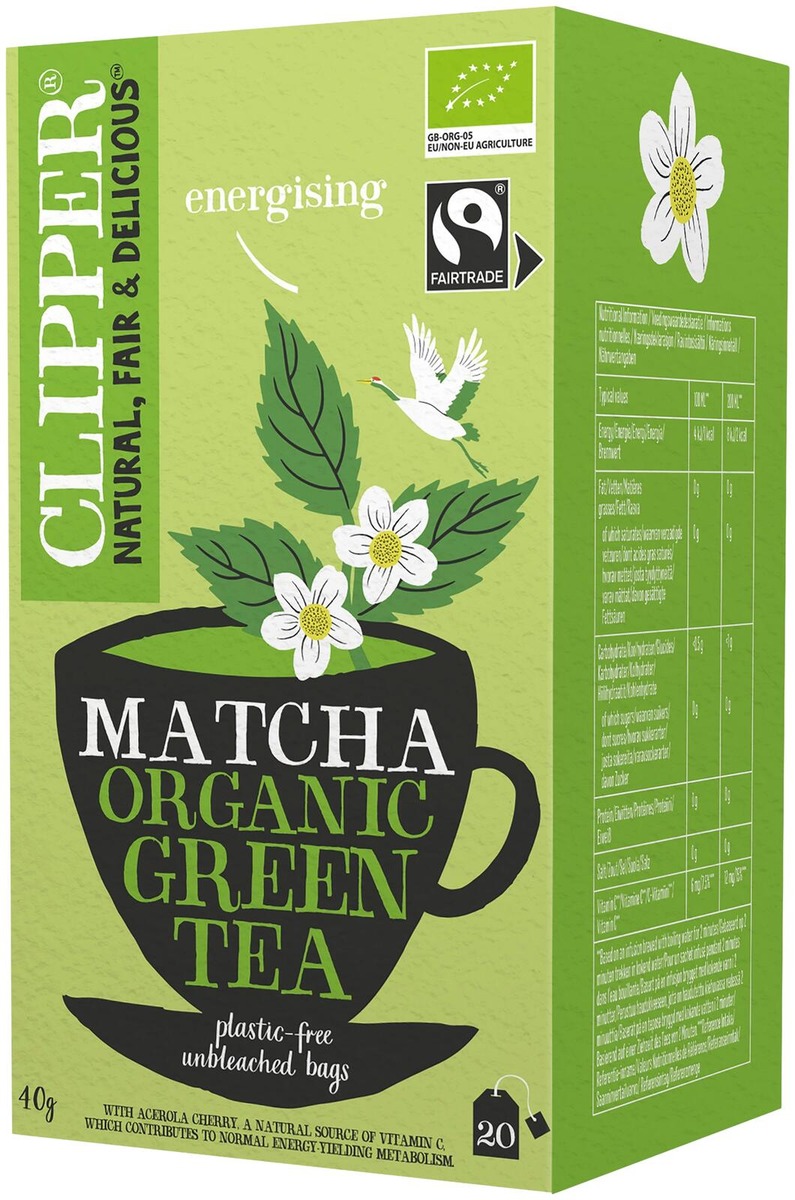 Clipperin korkealaatuinen Reilun kaupan vihreä luomutee, johon lisäpuhtia tuovat aito matcha sekä C-vitamiinipitoinen acerola-kirsikka. Energisoivalla kupillisella saat virtaa päivään.