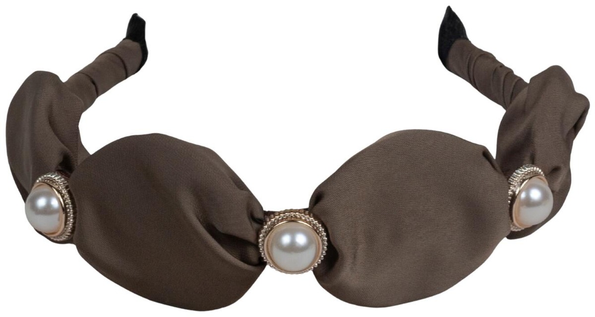 Ruskea satiinipanta, jossa näyttävät helmikortisteet. Sopii hyvin juhlaan, sekä arkeen.