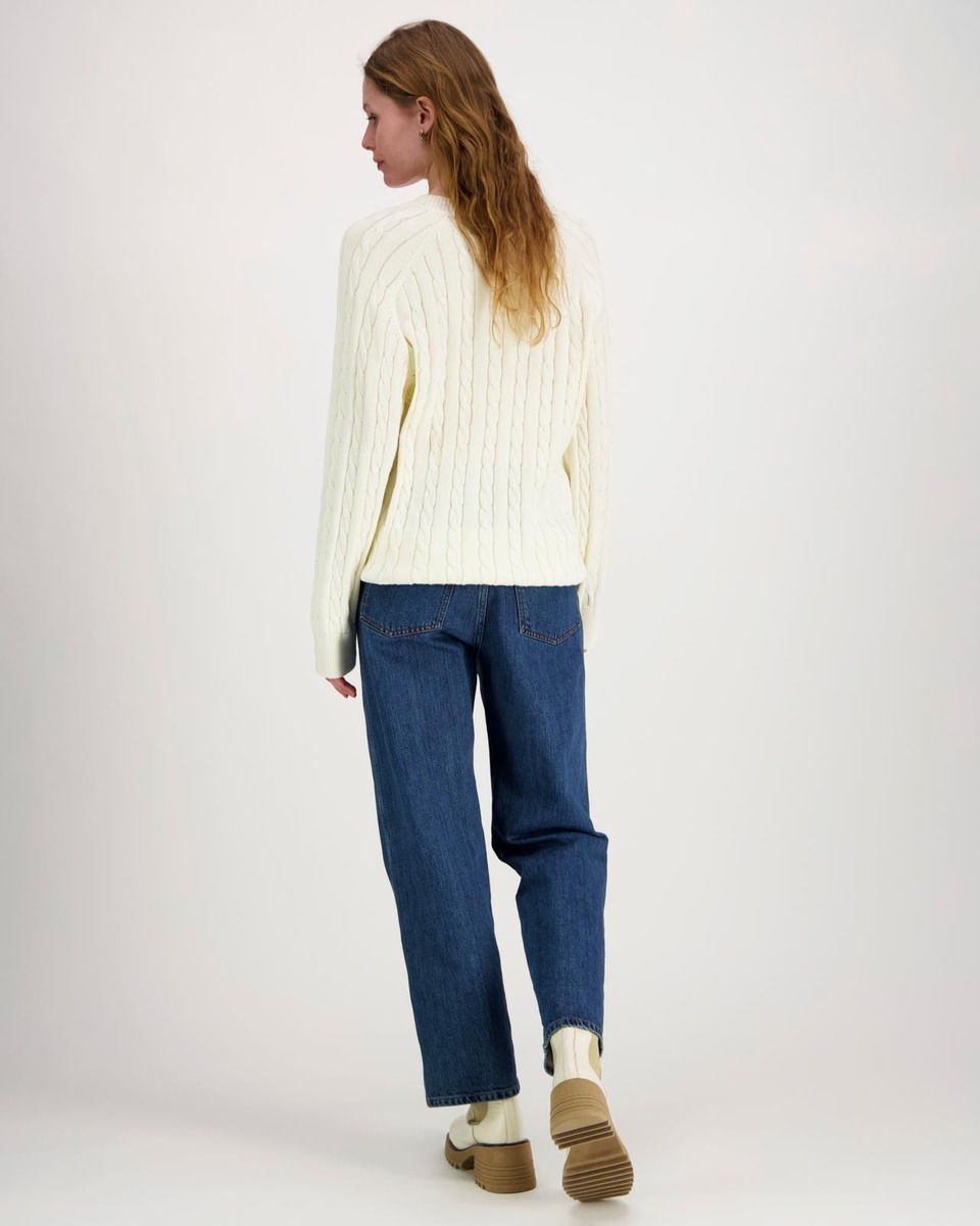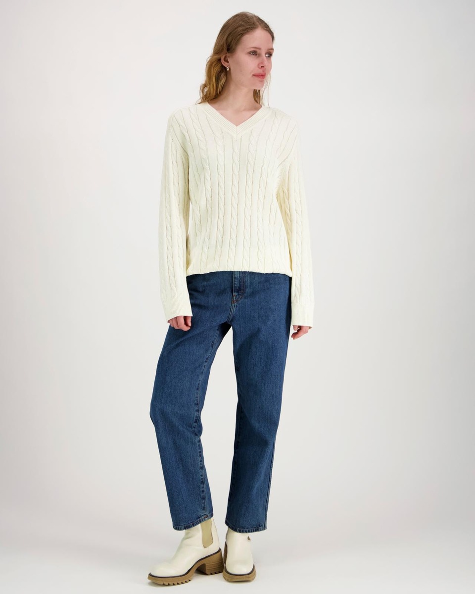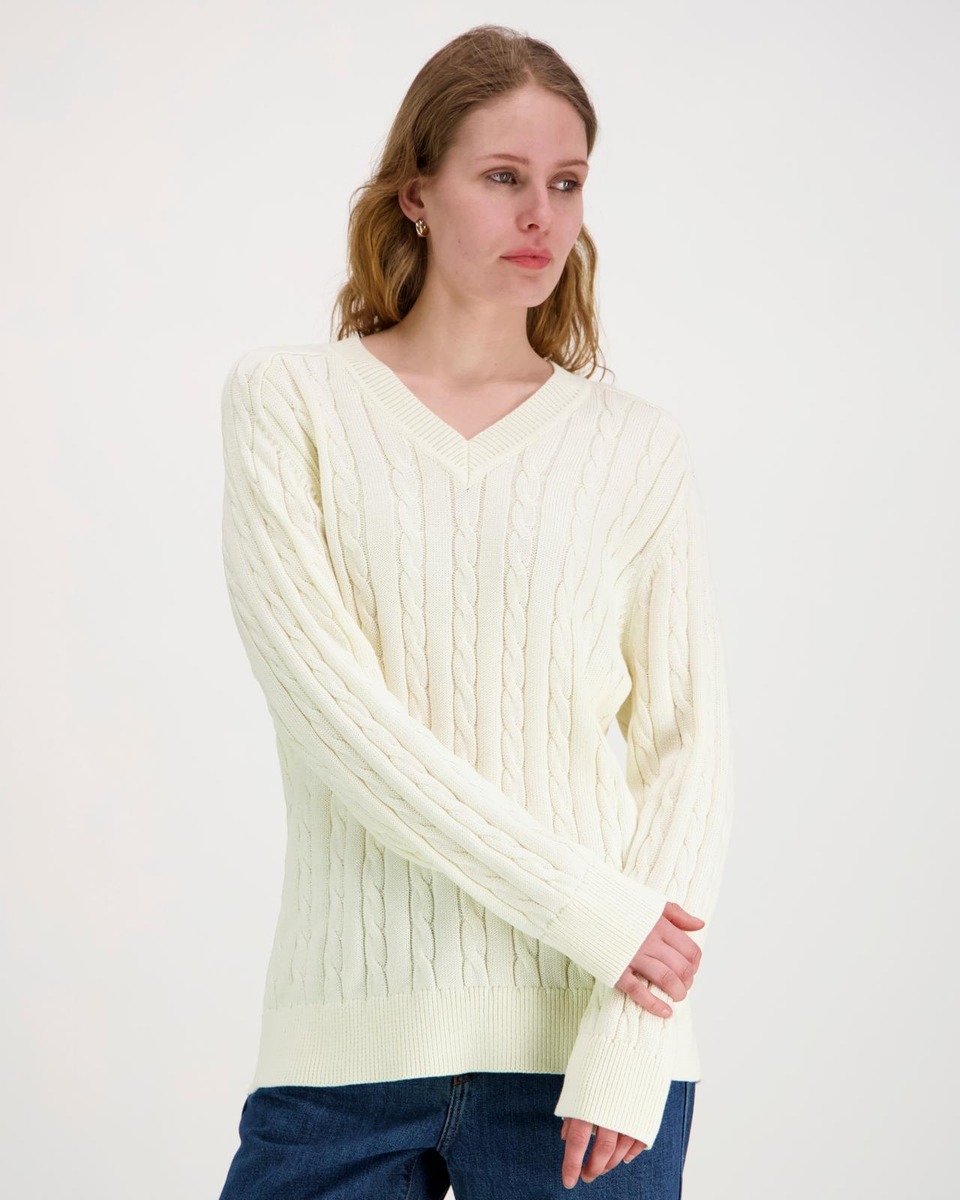 V-aukkoinen klassinen neulepusero.Neuleen kuvioletit puolikiiltävästä puuvillalangasta.