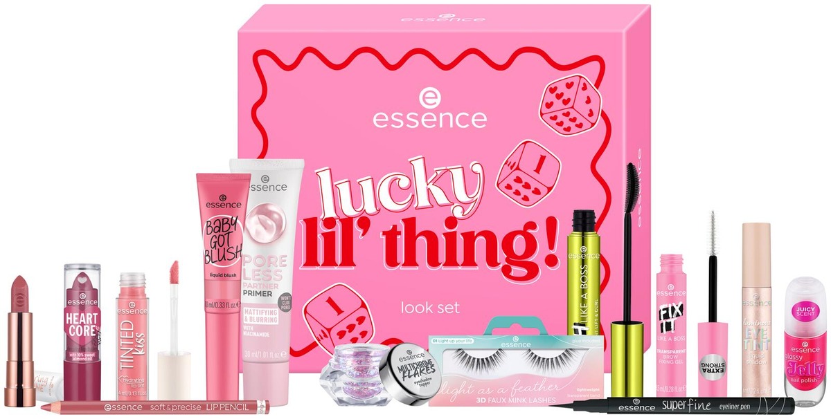 Onnekas olo? Olet juuri voittanut kauneusjackpotin essencen Lucky Lil' Thing setin avulla! Look Set. Siinä yhdistyvät 13 unenomaista tuotetta, joiden avulla voit luoda lookeja vaaleanpunaisista poskista ja kiiltävistä nuken huulista näyttäviin ripsiin. Kauniisti vaaleanpunaisiin ja punaisiin väreihin pakattu setti on lippusi trendikkääseen nuken inspiroimaan meikkityyliin. Setti sisältää tuotteita, joita voidaan yhdistellä ja kerrostaa keskenään ja voit luoda suloisia tai näyttäviä lookeja. Virheetön iho, kimaltelevat silmät, mehukkaat huulet ja kauniit kynnet – kaikki yhdessä setissä!