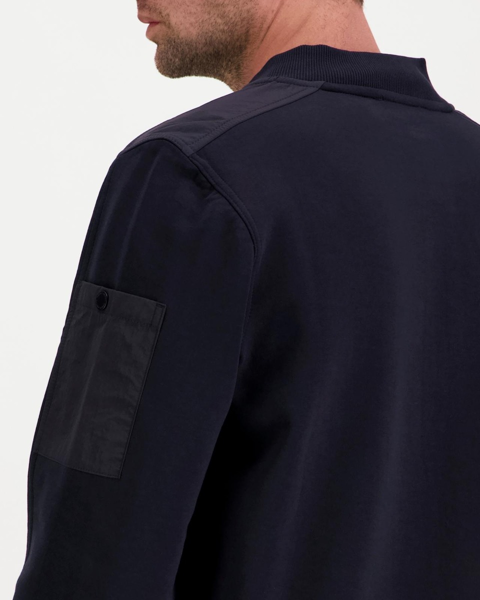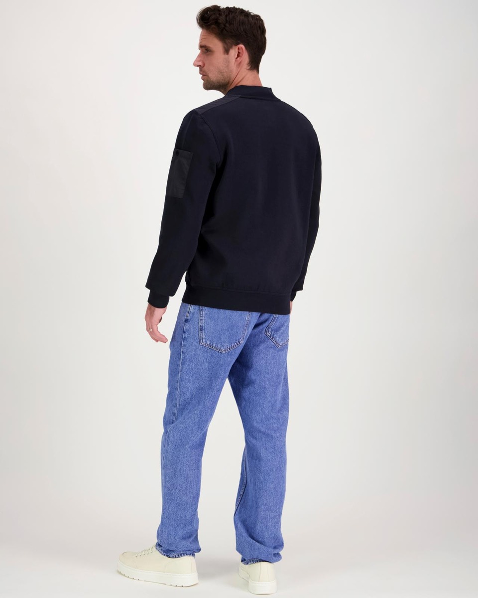 Bombermallinen collegetakki, joustava puuvillasekoite. Painonapit, vetoketjulliset taskut, hihatasku. Normaali mitoitus. Takapituus 72 cm.